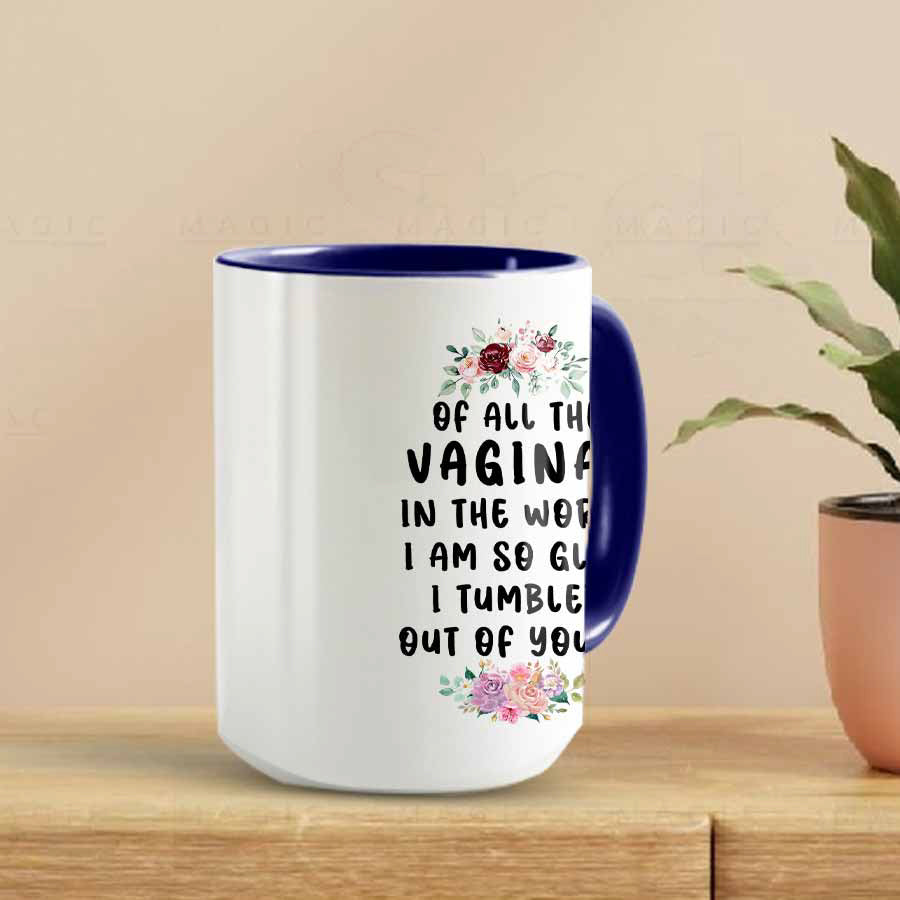 Style: One-color mug or unique accent mug with a two-tone rim, interior, and handle;