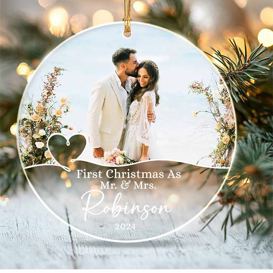 Celebrate your First Christmas together with our mr and mrs ornament | custom photo acrylic ornament for couple | 1-side printed circle shape designed specifically for couples! These beautiful ornaments are not just decorations; they are cherished keepsakes that capture the magic of your love story.