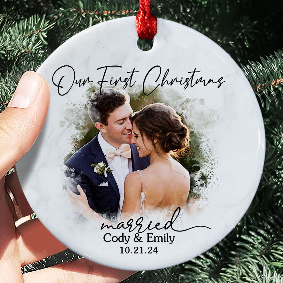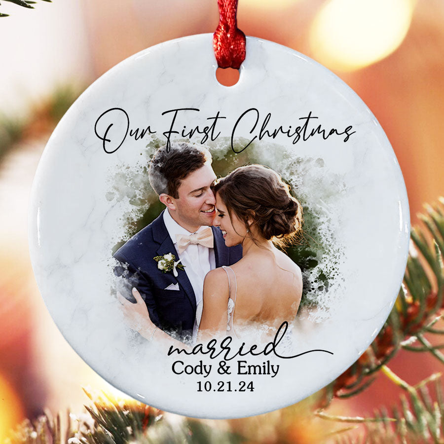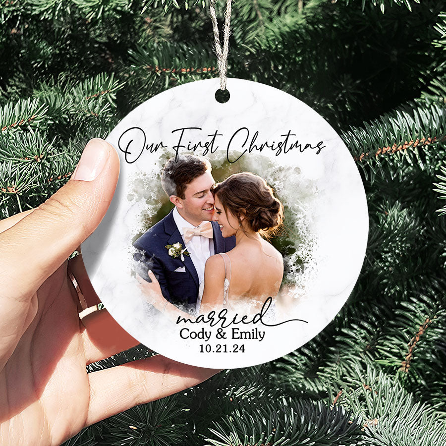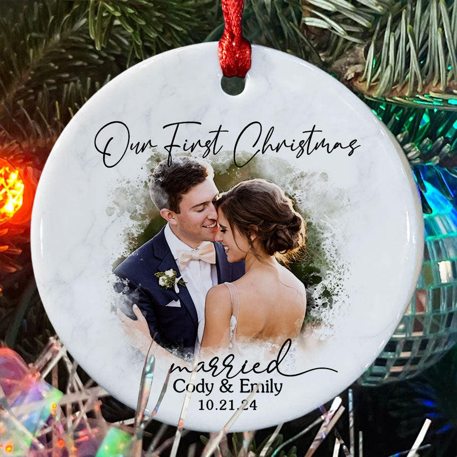 Celebrate your First Christmas together with our our first christmas married ornament | custom photo ceramic ornament for couple | 1-side printed circle shape designed specifically for couples! These beautiful ornaments are not just decorations; they are cherished keepsakes that capture the magic of your love story.