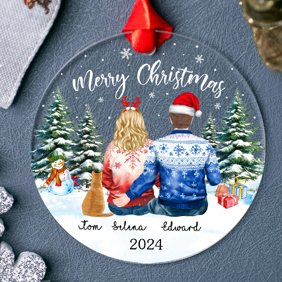This Christmas Eve, capture the magic of the season with our first christmas ornament | personalized couple acrylic ornament with cat | circle shape that celebrates your love and your furry friend. This unique ornament beautifully encapsulates those cherished moments spent together, making it a perfect addition to your holiday decorations. This gift is the perfect personalized Christmas ornaments for couples for the ones you love. You can choose from a wide range of Personalized Christmas Ornaments, each of which can be customized with the name or image of your favorite people.