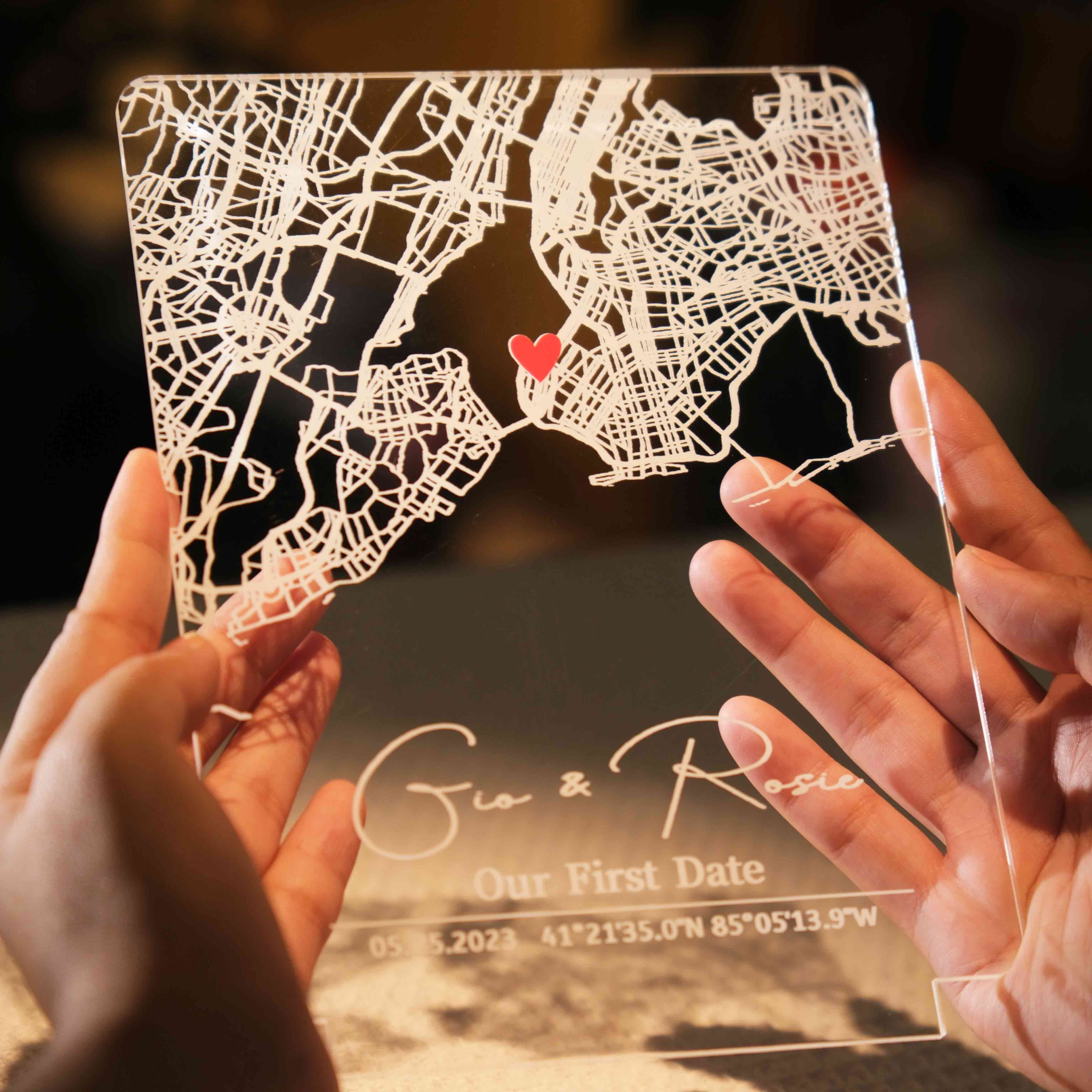 The custom our first date custom acrylic plaque led night light | custom map 1 year anniversary gift for boyfriend is designed to capture the essence of love in a tangible form. Made with the finest materials and attention to detail, this plaque features an elegant heart-shaped design, adorned with intricate patterns and delicate embellishments. Its exquisite craftsmanship ensures that it will become a cherished keepsake for years to come.