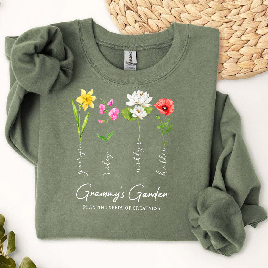 Keep grandma cozy in her garden oasis with the sweatshirt personalised gifts for grandma | personalized mother’s day garden gifts featuring her grandchildren's birth month flowers. This extraordinary grandma garden gift is more than just a piece of art; it's a heartfelt tribute to the incredible woman who has made a lasting impact on your life. Whether she's potting petite pansies or pruning her prize-winning petunias, Grandma's garden is where family bonds take root. It's her peaceful place to nurture nature's beauty and cherish moments with those who fill her world with joy.