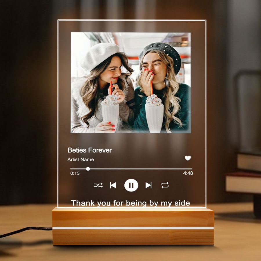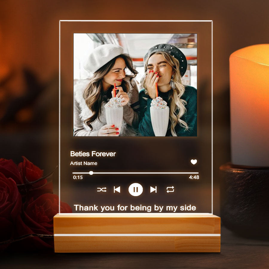 Imagine their delight as they unwrap a personalized best friend gifts | customized music song plaque featuring: Your most cherished photo together, immortalized in crystal-clear acrylic. Whether it's a silly selfie, a glamorous night out, or a heartwarming candid moment, this plaque will bring that memory to life every time they look at it.