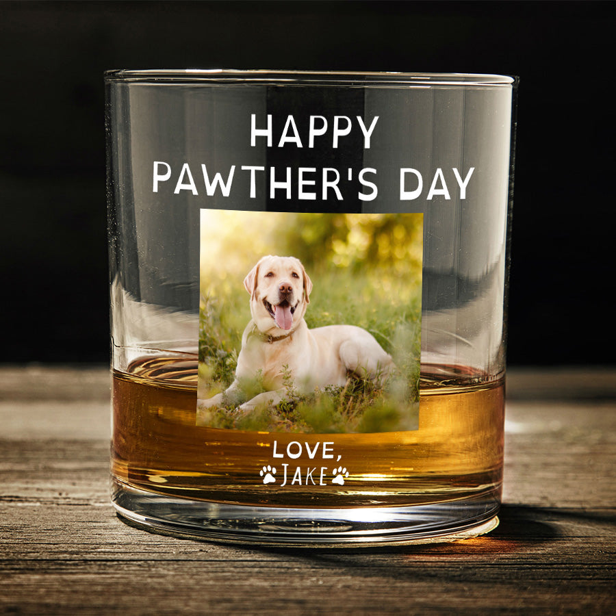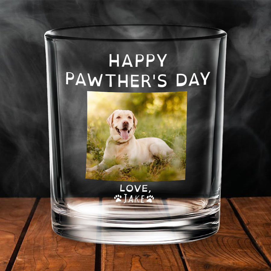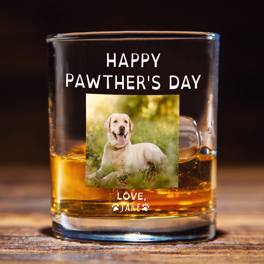 Fathers will smile when they see their face looking back at them from this one-of-a kind whiskey glass, surrounded by paw prints and images of their loyal dog companions.
