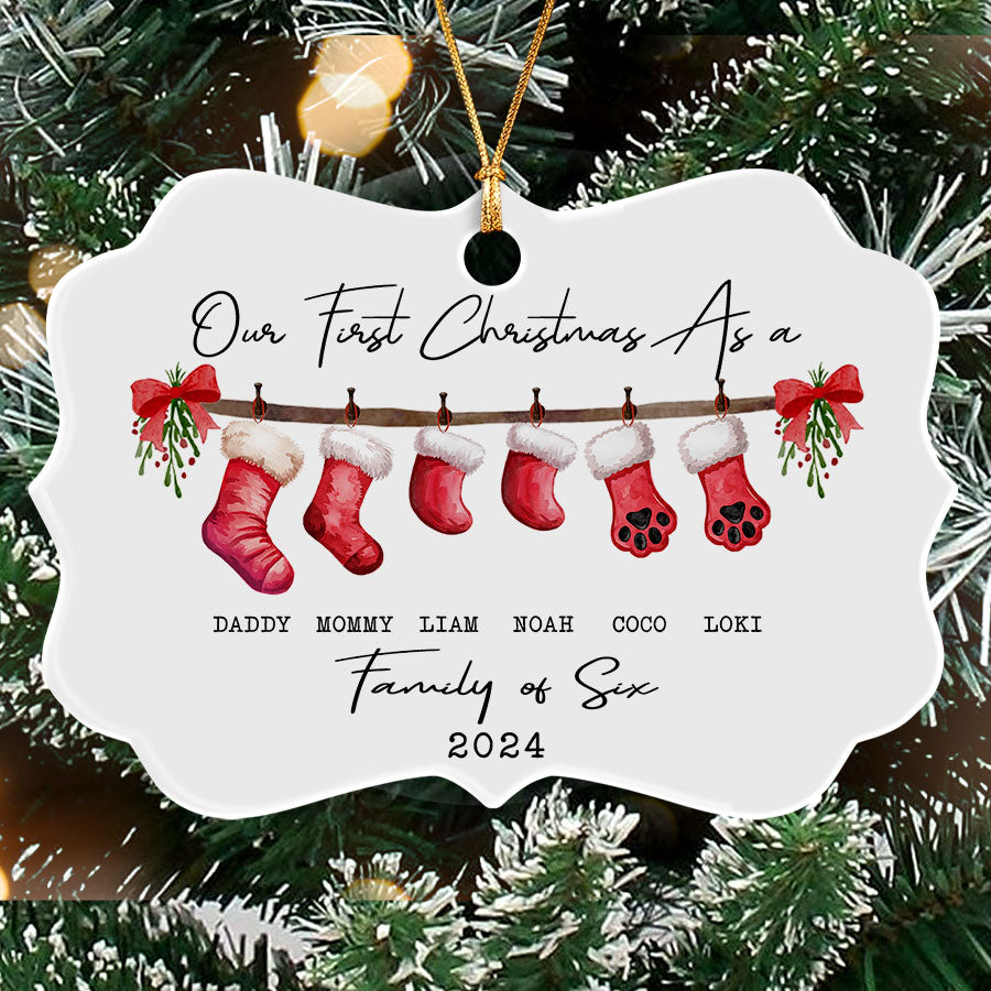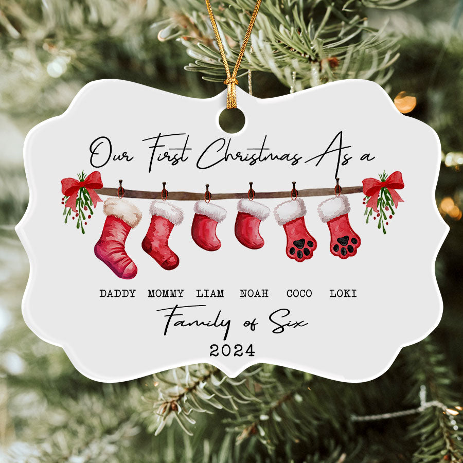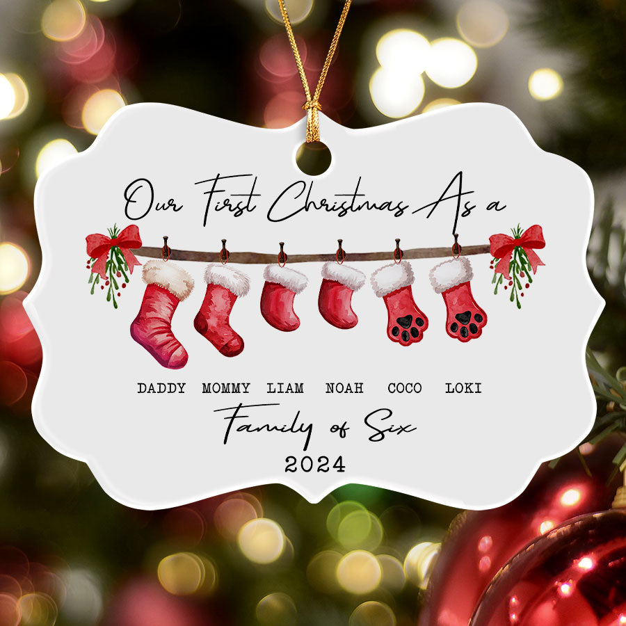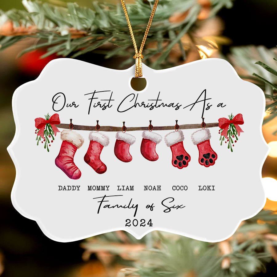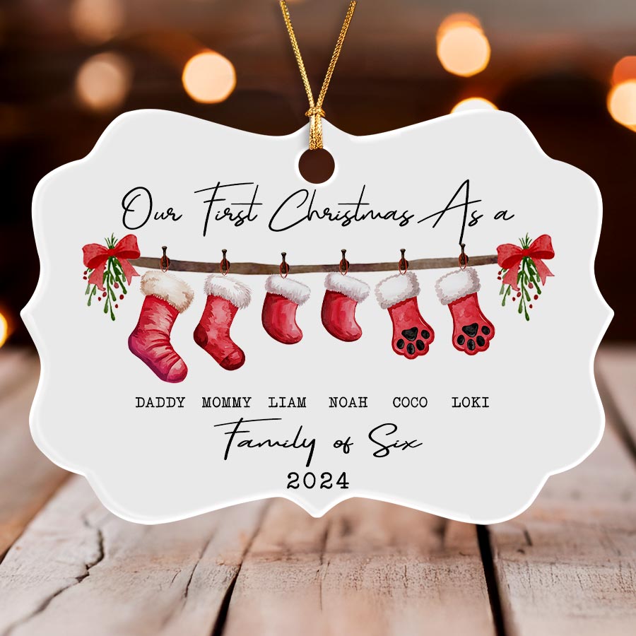 Every family has special moments. Let this personalized family christmas ornament | first christmas family of 6 ornament | medallion ceramic shape become a symbol of love and cherished memories in your family!