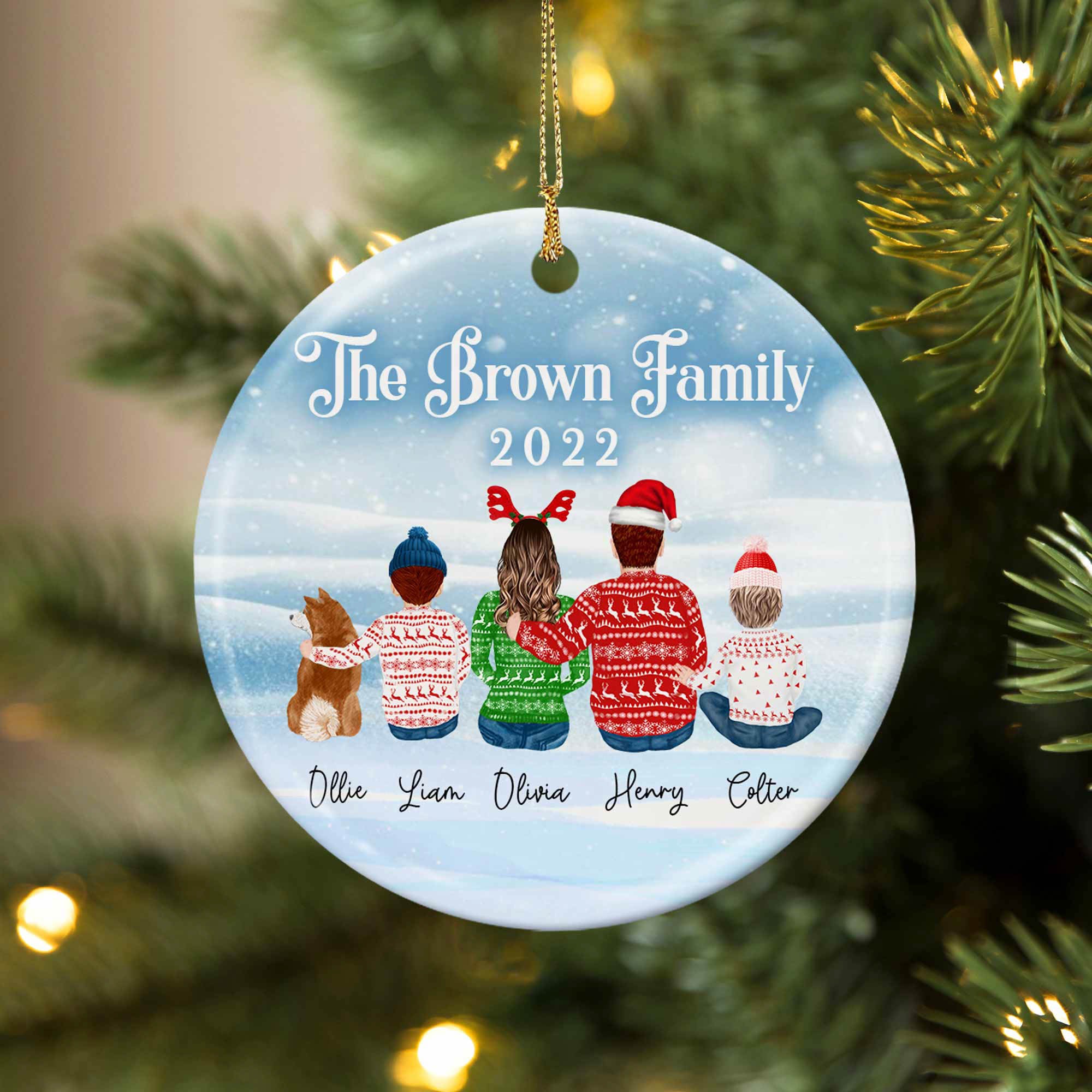 You can select the hairstyles, outfits, and accessories for each family member while creating a bespoke family ornament. Include your dogs in the design to give it a fun spin.
