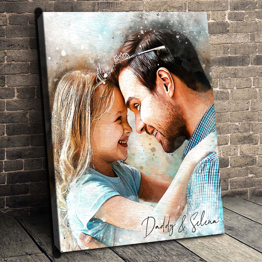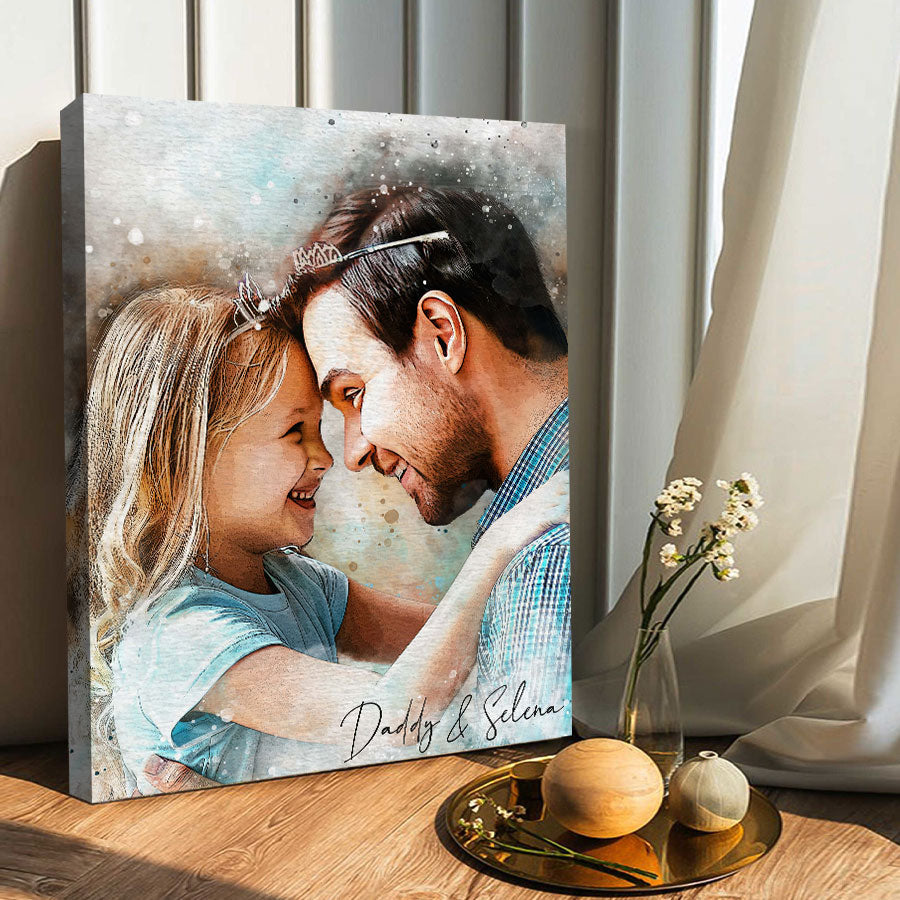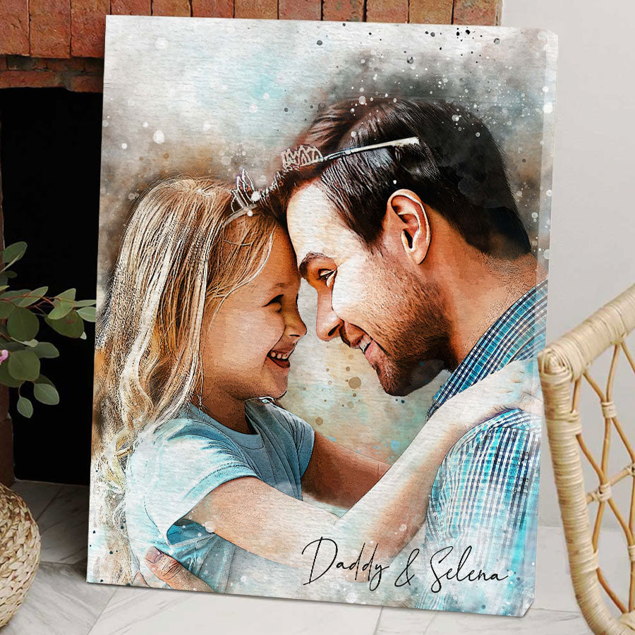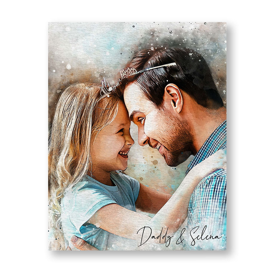 Treat the new dad in your life to personalized father daughter gifts | custom watercolor dad portrait canvas that commemorates the baby's arrival and his first Father's Day. Our personalized photo canvas is sure to bring a smile seeing little ones grow up before their eyes. Customize it FREE now - he will love displaying this treasured memory for many years to come.