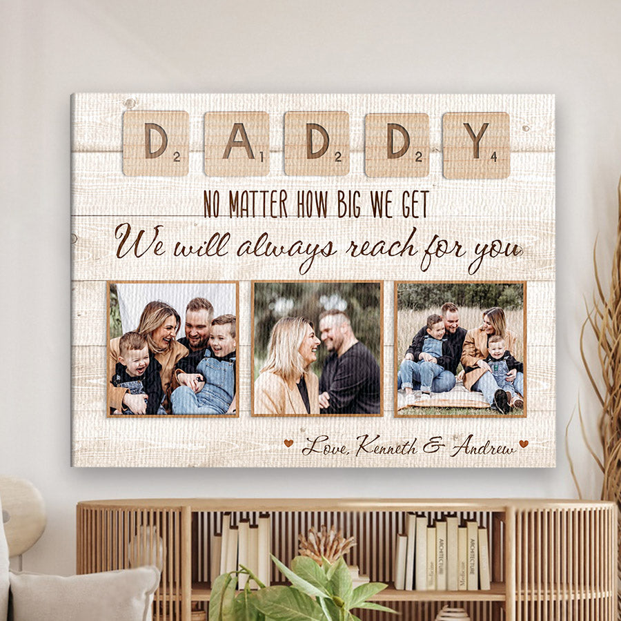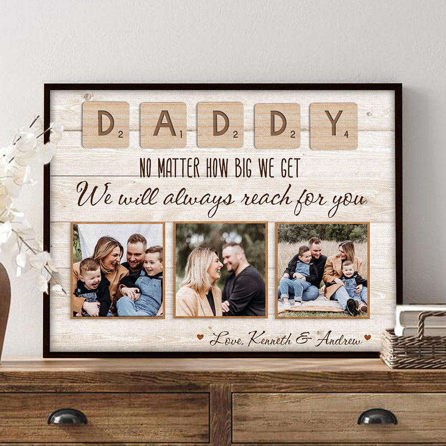 What better way to show your appreciation for Dad than a personalized fathers day gift 2024 | custom fathers day gift | daddy canvas that captures memories you've created together over the years? This high-quality gift comes ready to be customized with photos that will bring a smile to his face each time he looks at it. From childhood pictures to recent family vacations, you can select images that remind him of how much he means to you and your family.