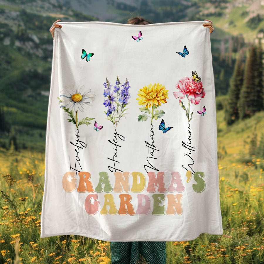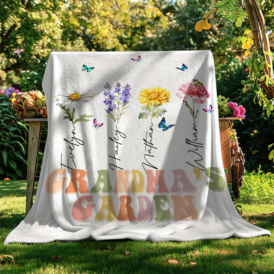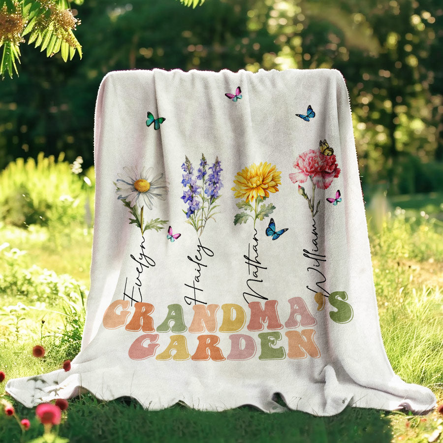 Grandmas Garden Blanket | Personalised Grandma Gifts For Mothers Day | Blue Birth Flower Blanket | Grandma'S Garden Love Grows Here Gift