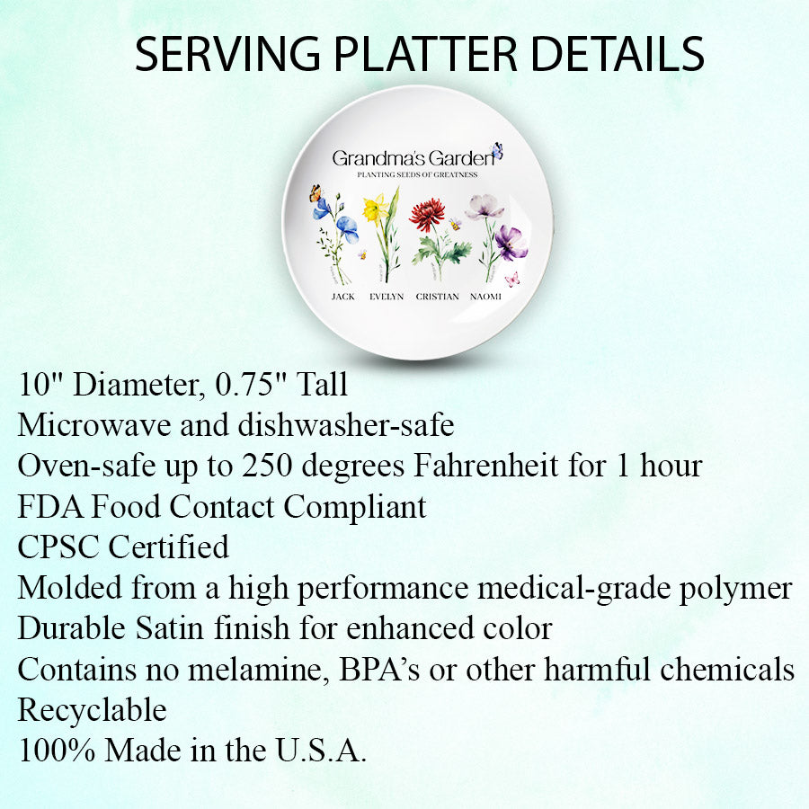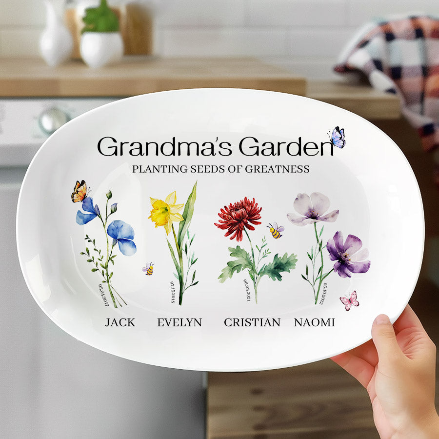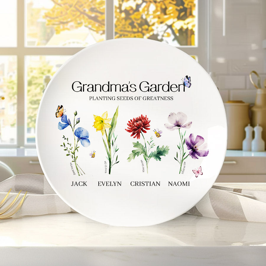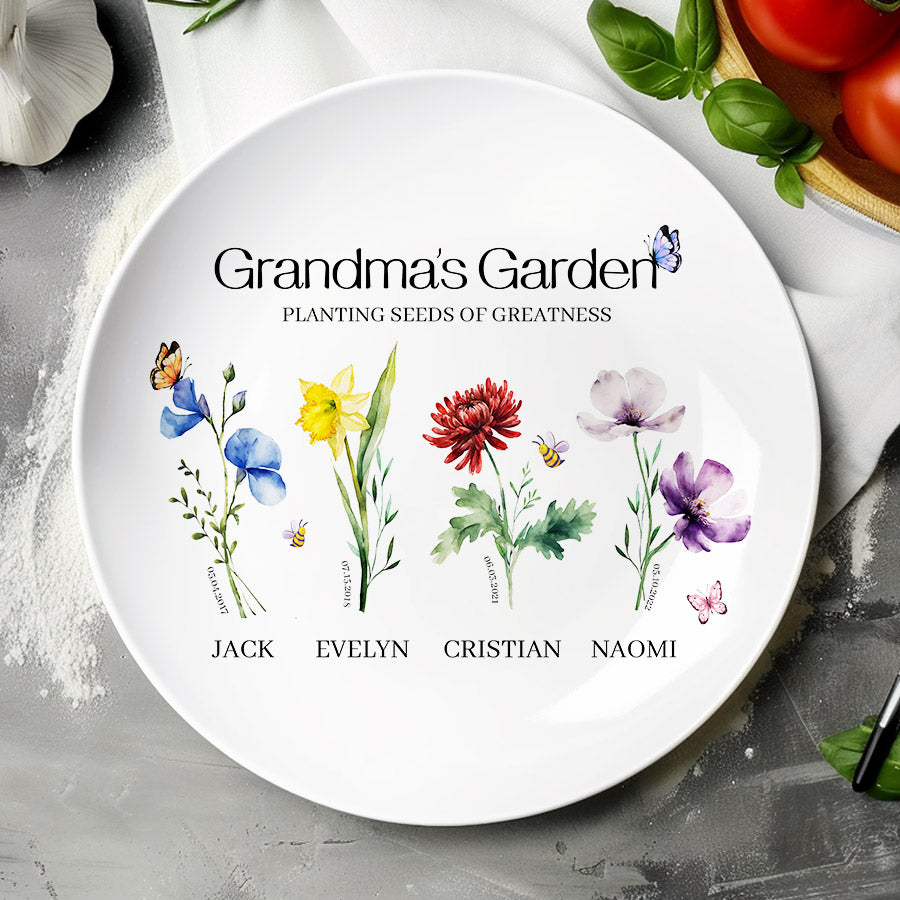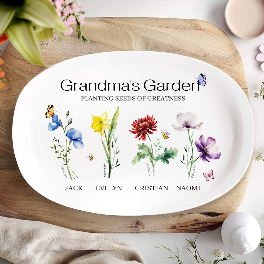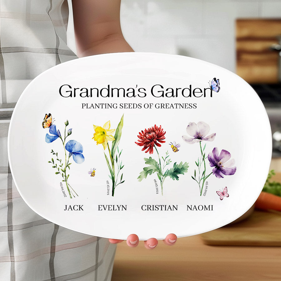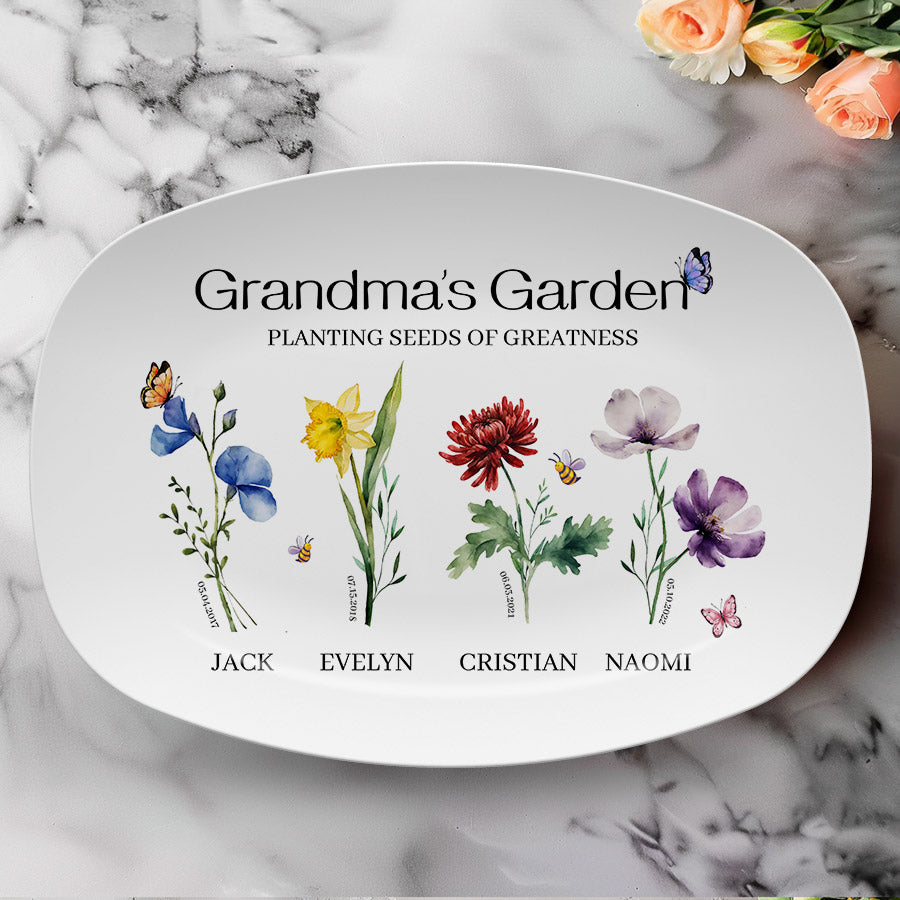 Bring joy to grandma's garden with this one-of-a-kind grill plate that she is sure to treasure. Customize personalized gifts for grandma from grandkids | personalised mother gifts free with an assortment of color images representing the birth month flowers of her precious grandchildren. What better way to honor all the memories made in her special outdoor space over the years? This extraordinary grandma garden gift is more than just a piece of art; it's a heartfelt tribute to the incredible woman who has made a lasting impact on your life.