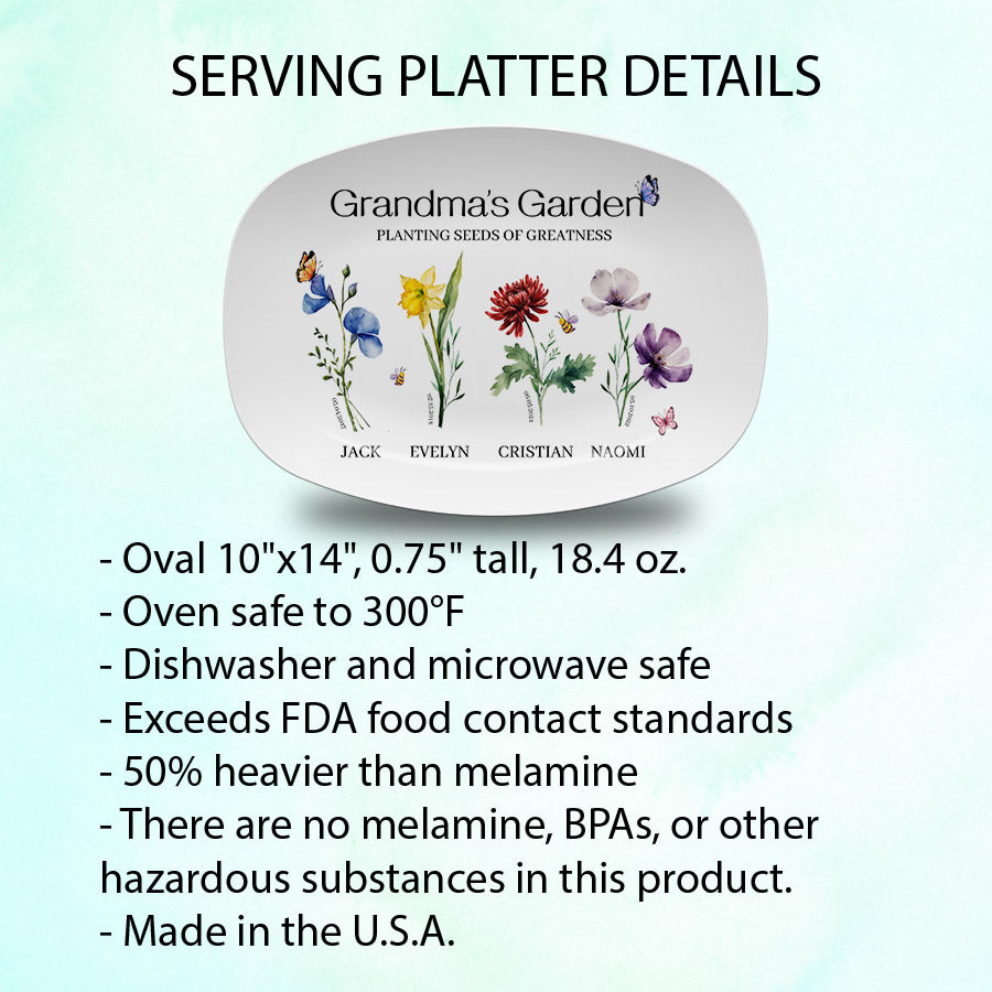 Grandma's garden is more than just a place to grow plants - it's where family traditions take root and thrive. It's a magical spot where children become enlightened about nature's beauty. This personalized grill plate pays tribute to her nurturing role and celebrates the bonds that have been strengthened within her verdant domain.