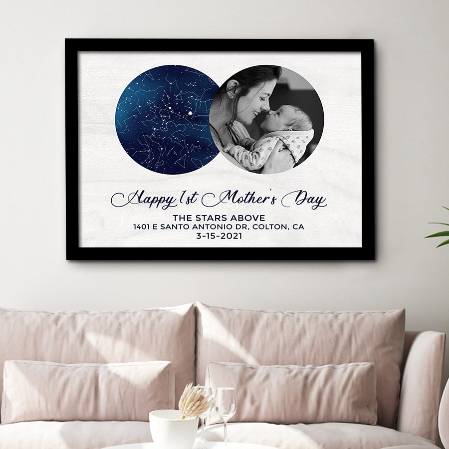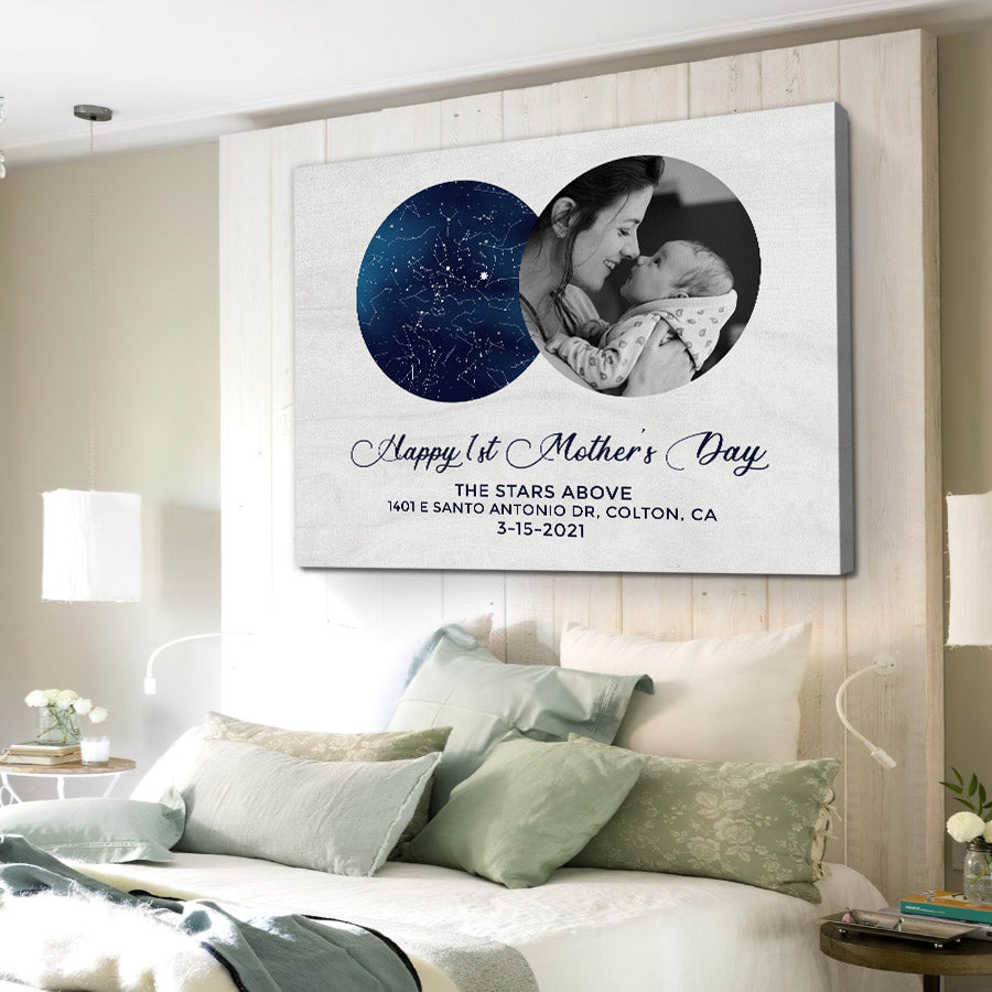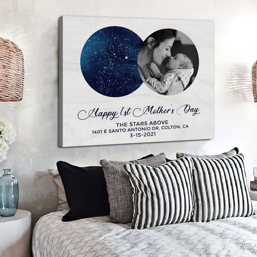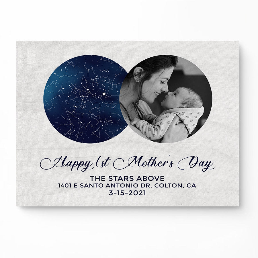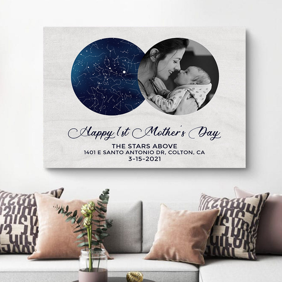 🌸A gift full of love from baby's first Mother's Day. Help mom celebrate her new chapter with personalized gifts for new mom | custom star map canvas mothers day gifts as unique as her journey into motherhood. This personalized canvas makes a perfect present full of love and memories for a new mom's very first Mother's Day.