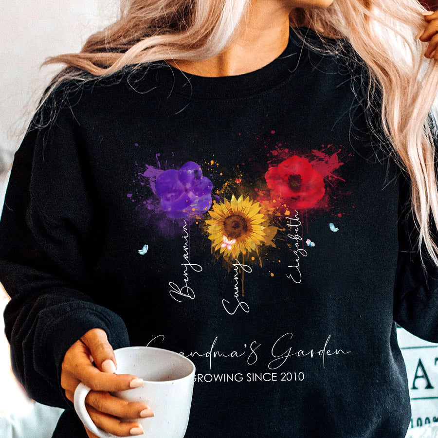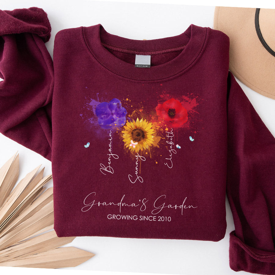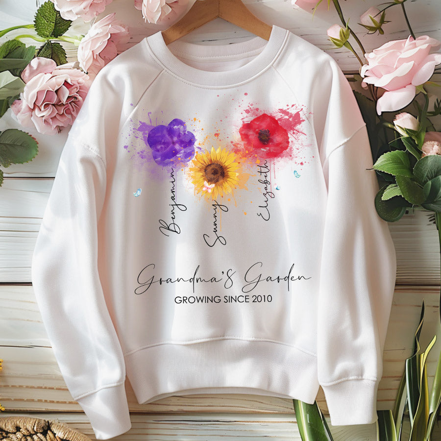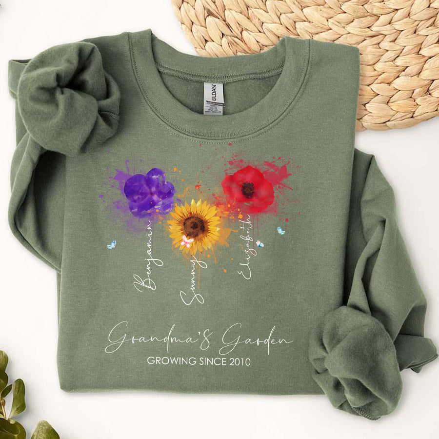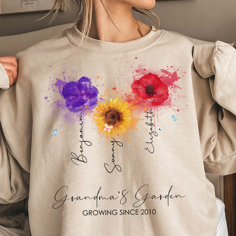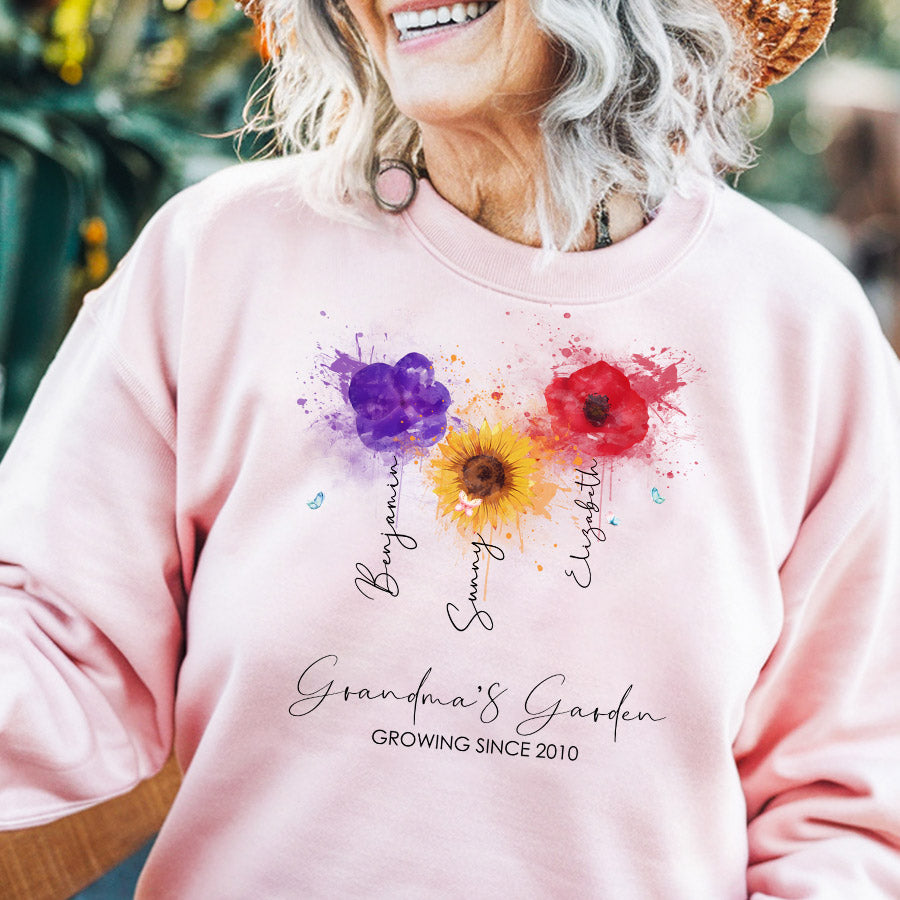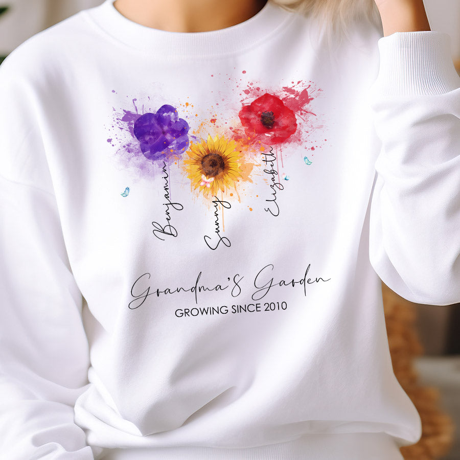 Keep grandma cozy in her garden oasis with the sweatshirt personalized mother’s day garden gifts | personalised gifts for grandma featuring her grandchildren's birth month flowers. This extraordinary grandma garden gift is more than just a piece of art; it's a heartfelt tribute to the incredible woman who has made a lasting impact on your life. Whether she's potting petite pansies or pruning her prize-winning petunias, Grandma's garden is where family bonds take root. It's her peaceful place to nurture nature's beauty and cherish moments with those who fill her world with joy.
