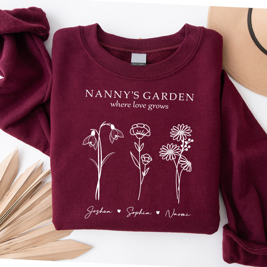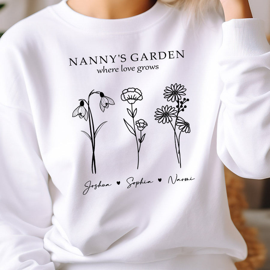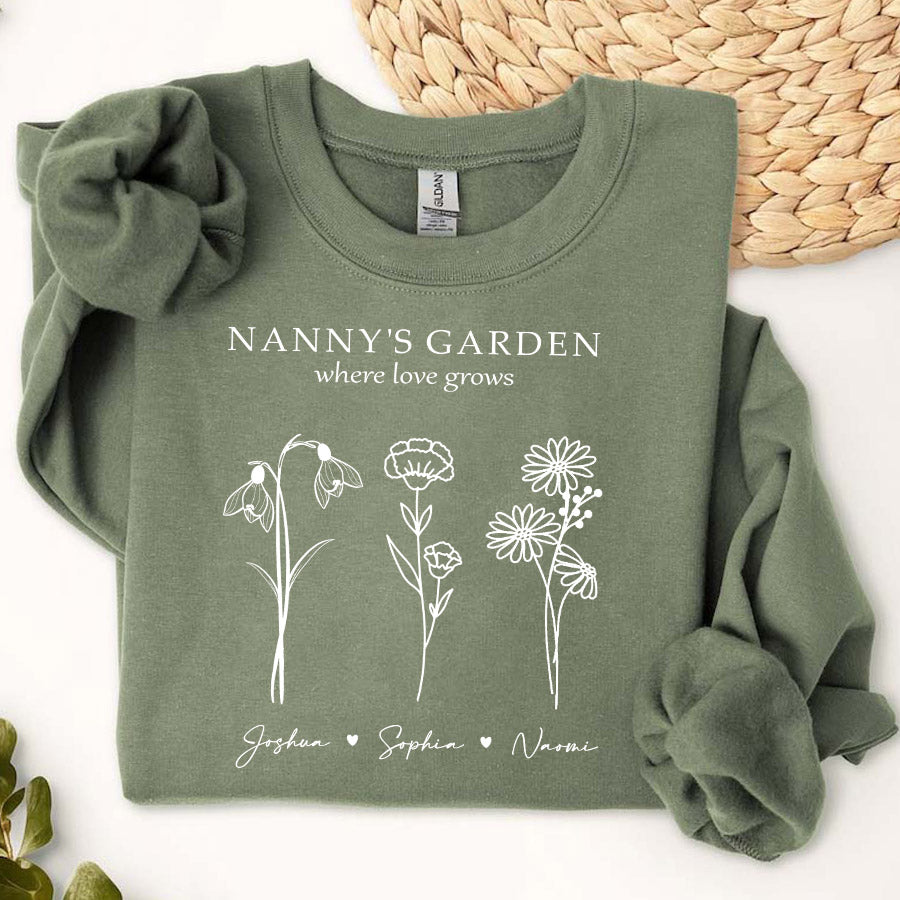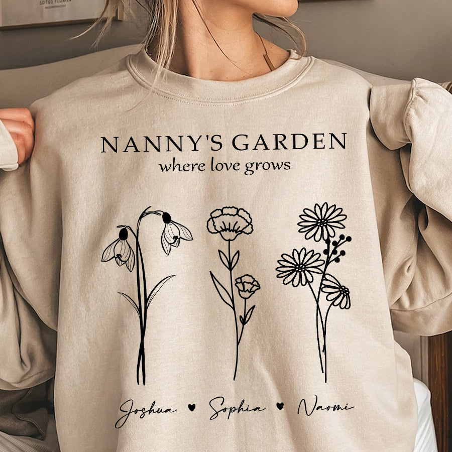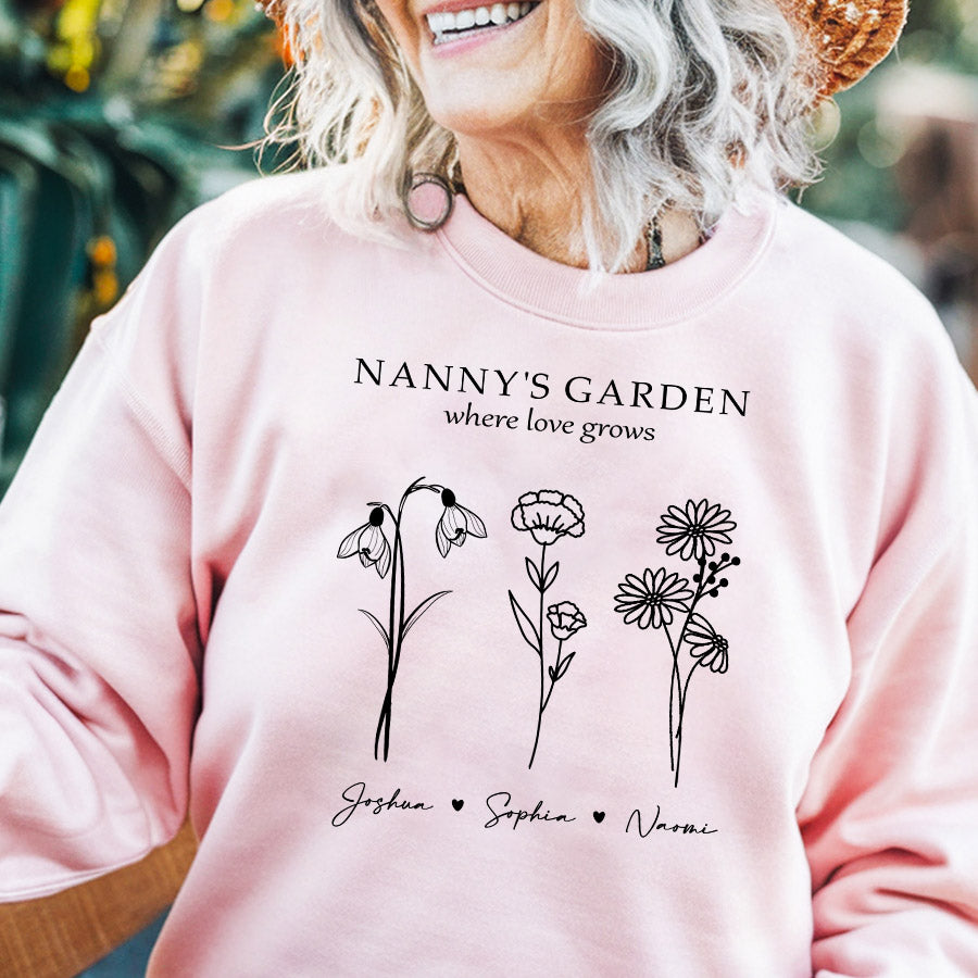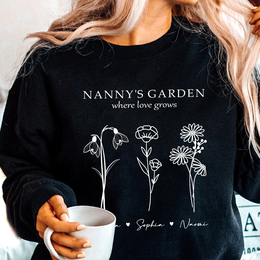 Keep grandma cozy in her garden oasis with the sweatshirt personalized mother’s day gifts for grandma | custom grandmas garden gifts featuring her grandchildren's birth month flowers. This extraordinary grandma garden gift is more than just a piece of art; it's a heartfelt tribute to the incredible woman who has made a lasting impact on your life. Whether she's potting petite pansies or pruning her prize-winning petunias, Grandma's garden is where family bonds take root. It's her peaceful place to nurture nature's beauty and cherish moments with those who fill her world with joy.