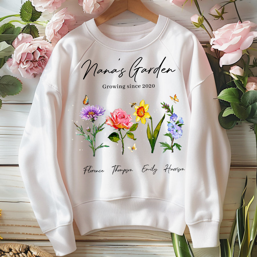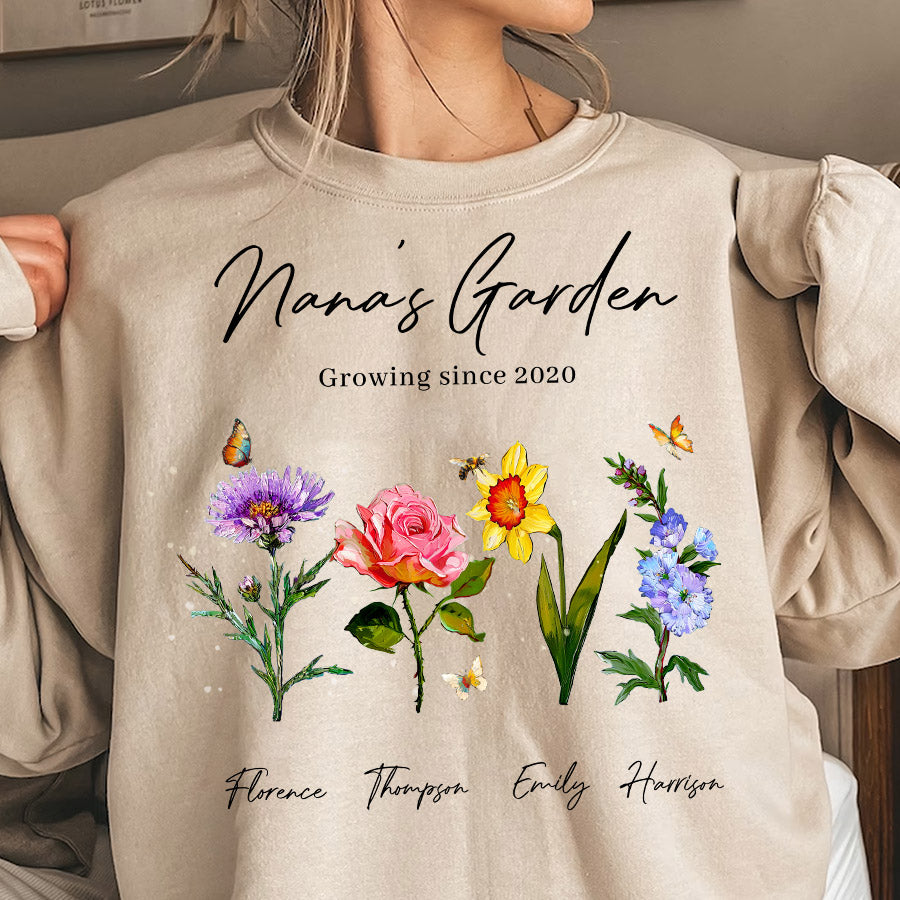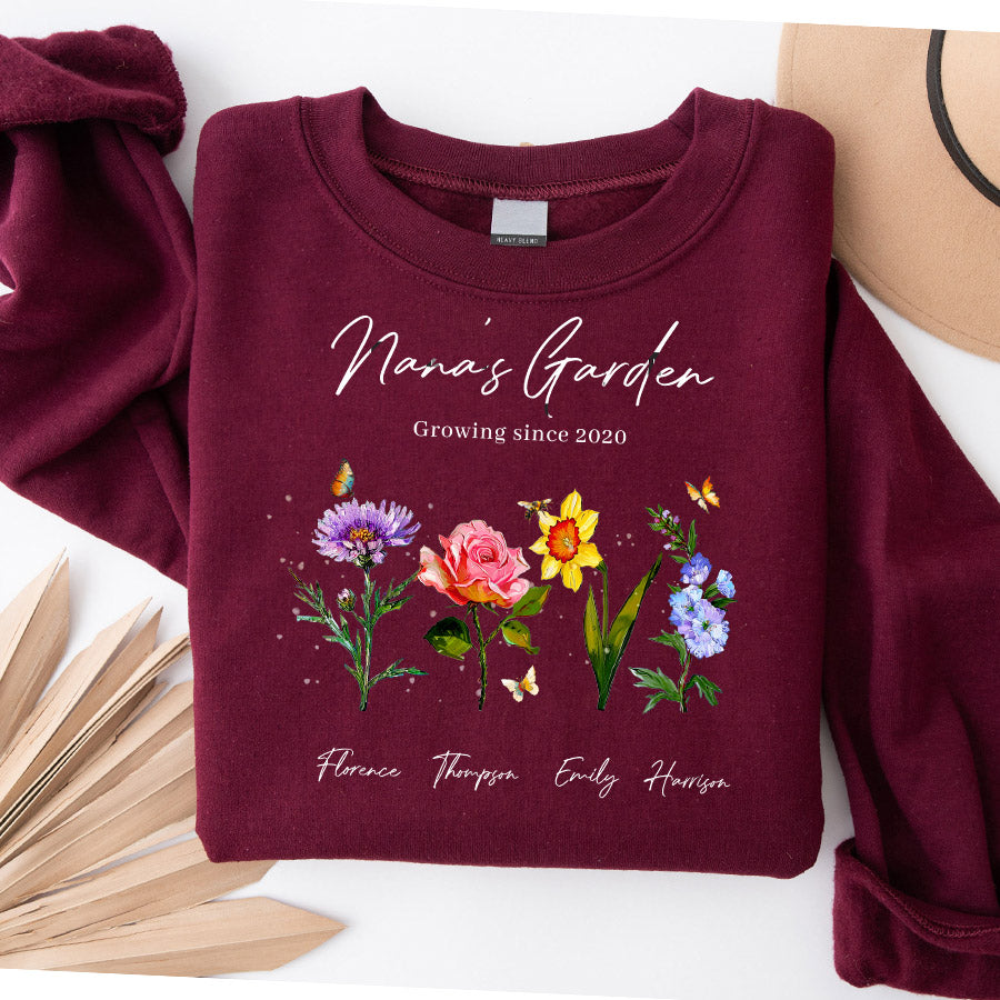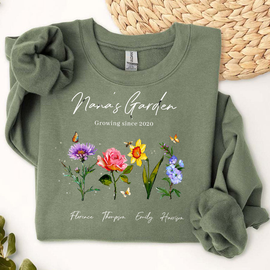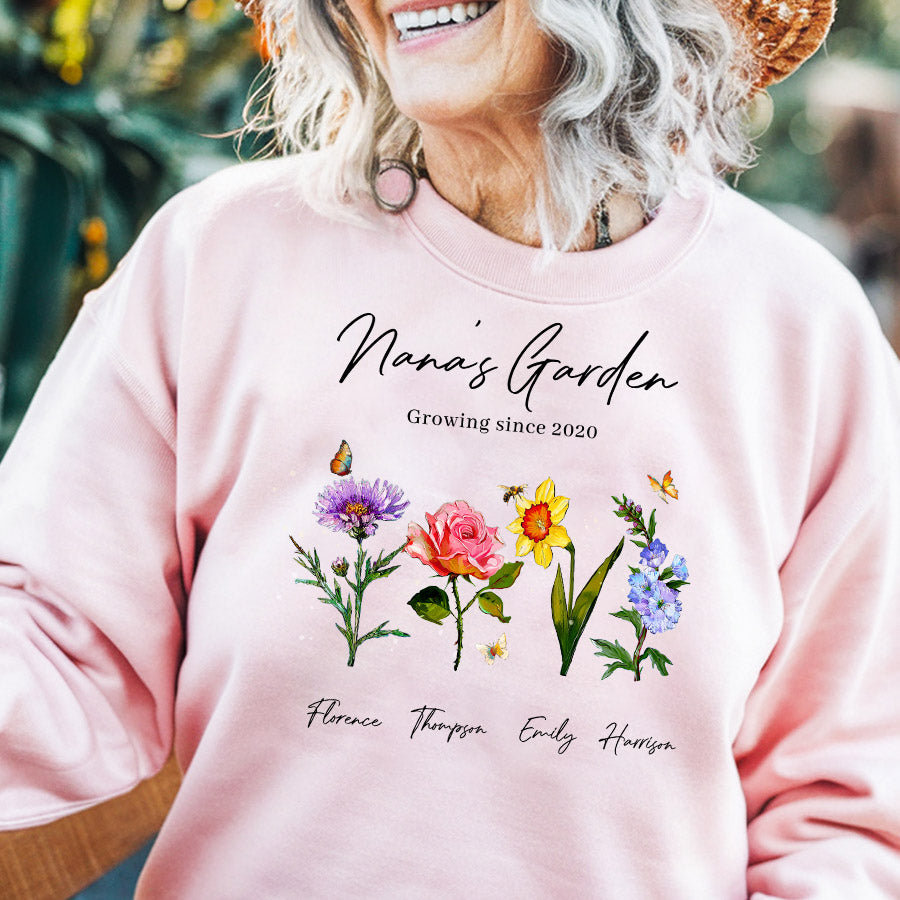 Keep grandma cozy in her garden oasis with the sweatshirt personalized nana gift | personalized mother’s day garden gifts featuring her grandchildren's birth month flowers. This extraordinary grandma garden gift is more than just a piece of art; it's a heartfelt tribute to the incredible woman who has made a lasting impact on your life. Whether she's potting petite pansies or pruning her prize-winning petunias, Grandma's garden is where family bonds take root. It's her peaceful place to nurture nature's beauty and cherish moments with those who fill her world with joy.