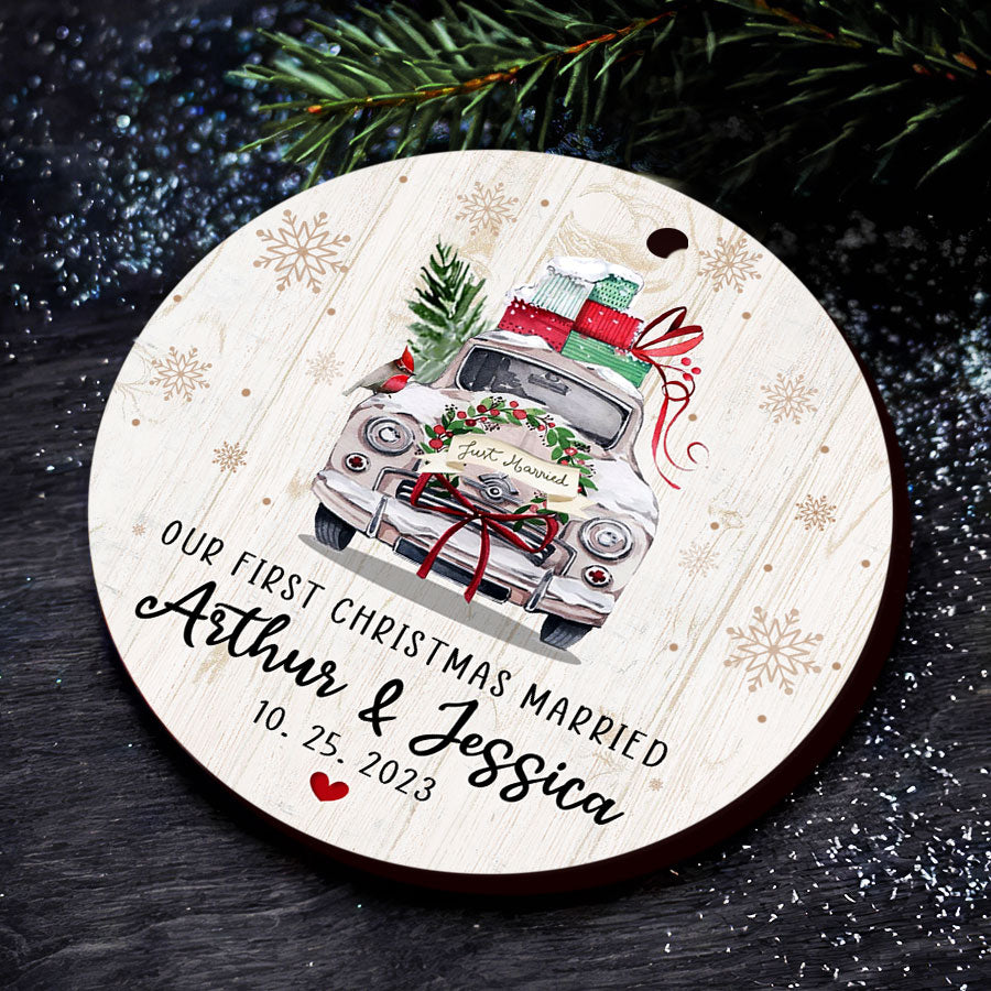 Celebrate your love and special day with personalized ornaments for newlyweds for your tree. The wedding gift Christmas ornaments display your names, wedding date, or a short message to immortalize your marriage for the holidays to come. Hanging proudly year after year, these Personalized Christmas Ornaments will become a treasured tradition reminding you of your commitment to one another.