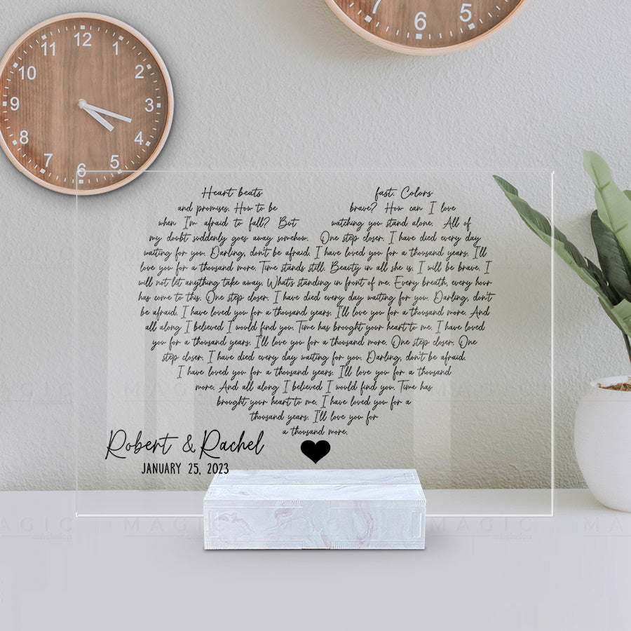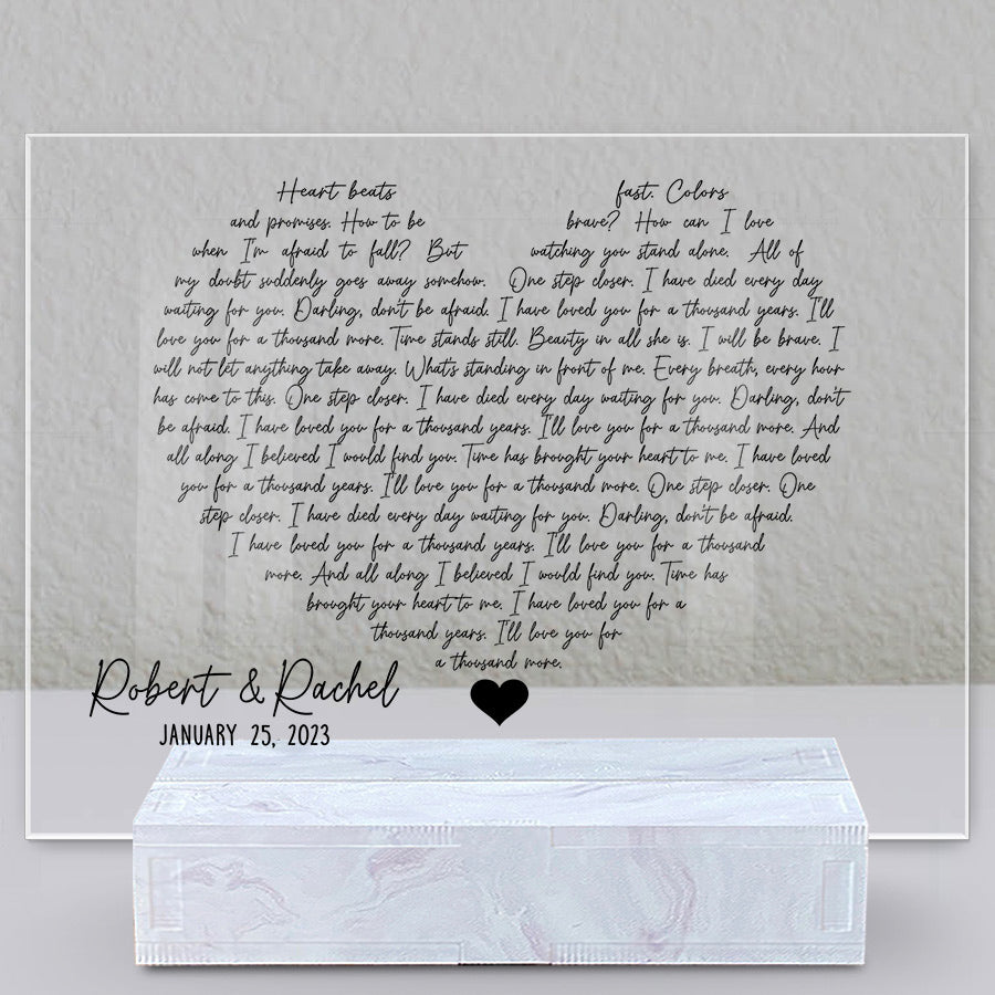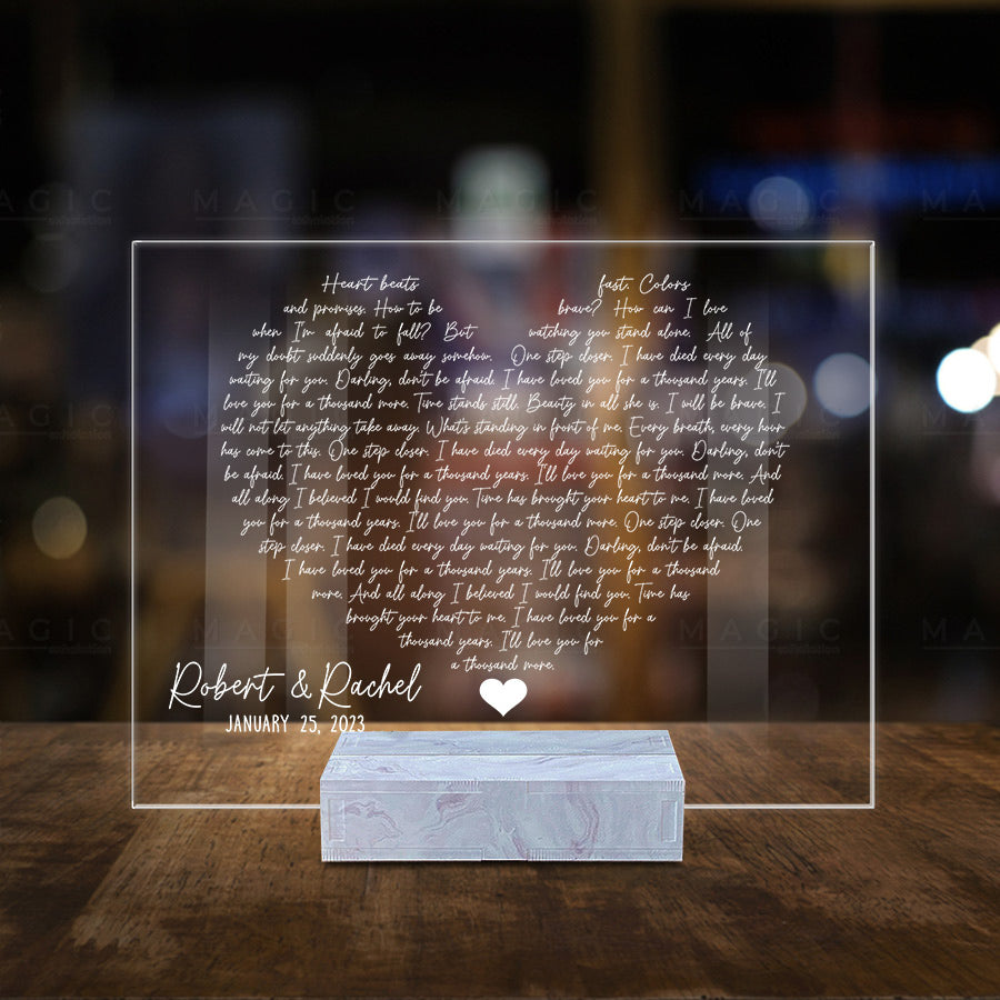 This personalized song gift is durable and designed to last, allowing you to capture and commemorate special memories for years to come. You can personalize the plaque with your couple name, a special message, or even an image of your choice. It's the perfect way to show your love and appreciation for the one you care about.