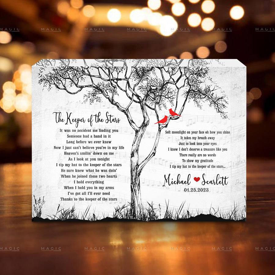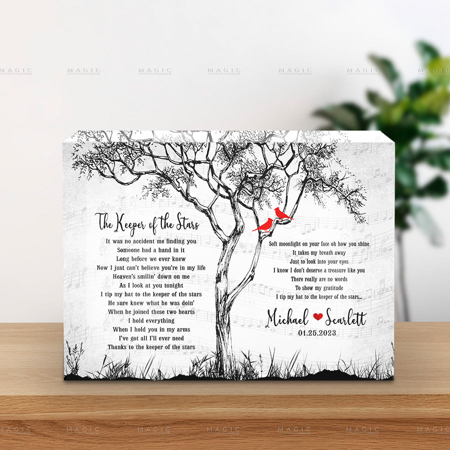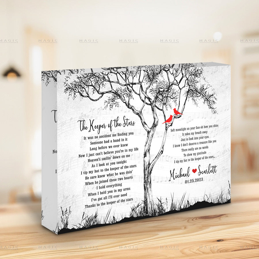 This printed song lyrics gift acrylic block comes in a variety of sizes and shapes so you can find just the right fit for your special someone. Plus, you can personalize it with your couple's name or even a photo so your gift will be truly unique and special.