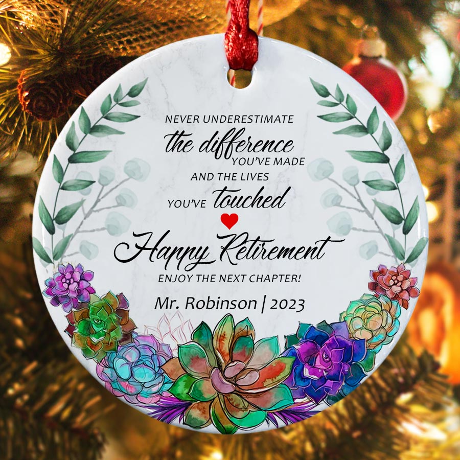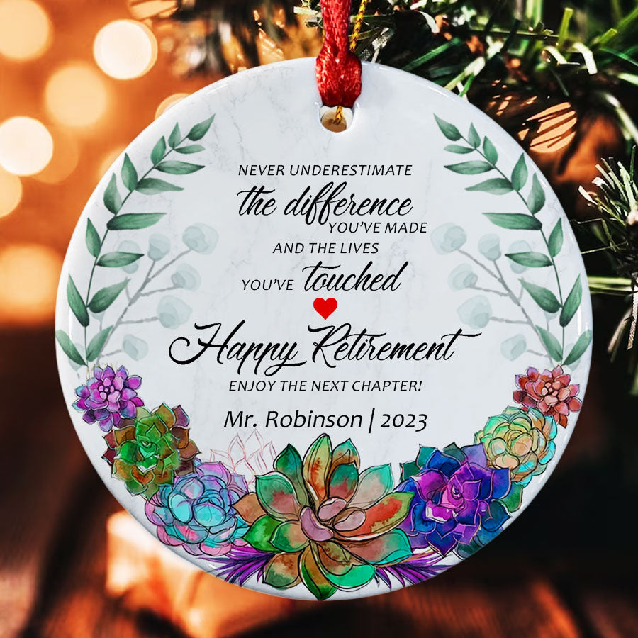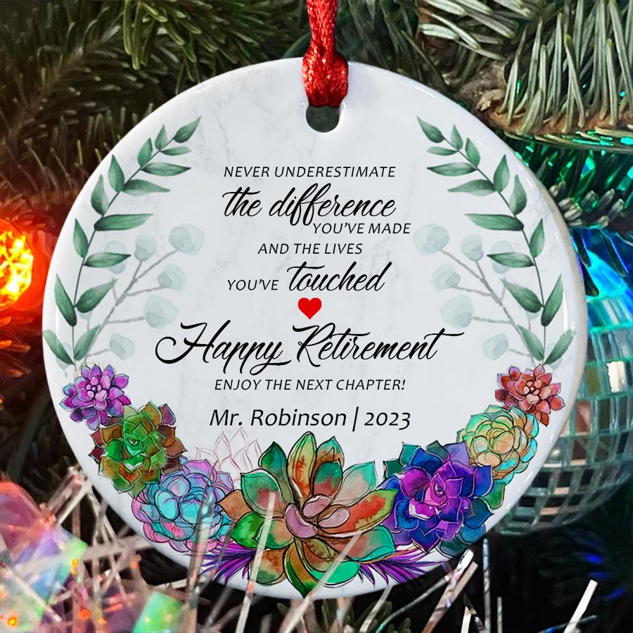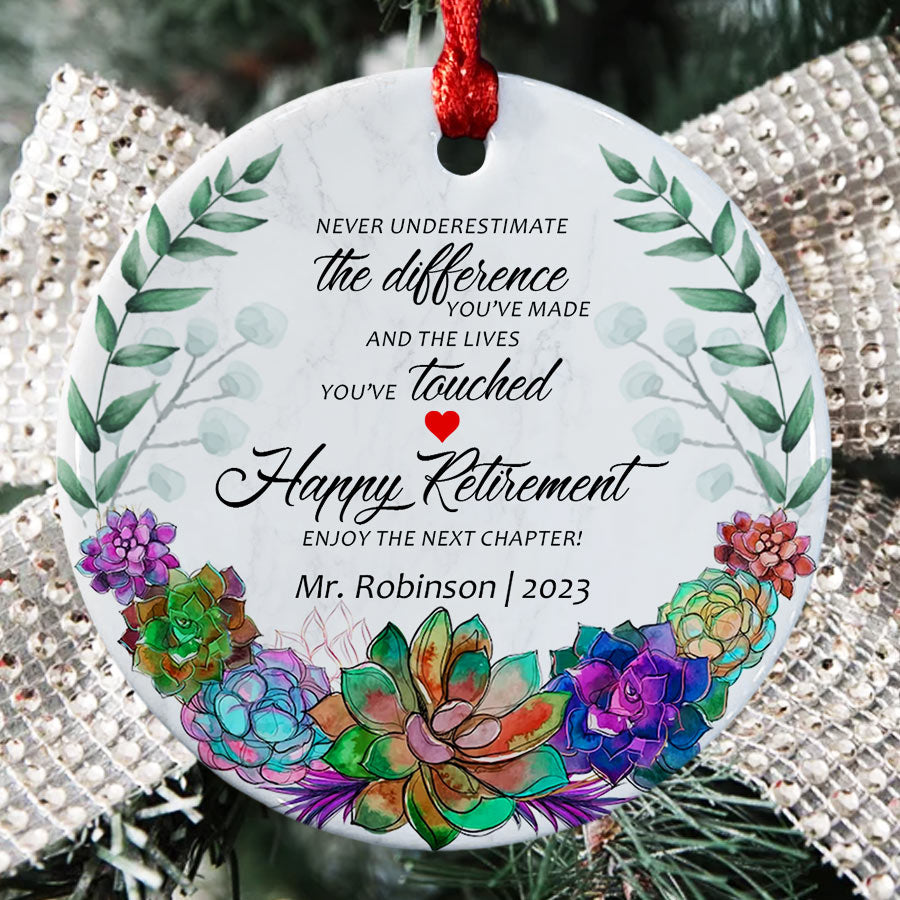 As a parent of a student, you know how much teachers impact our children's lives each day. Our retired teacher ornament makes a thoughtful way to honor the special educator who inspires your child. Rather than another generic teacher ornament, these personalized Christmas ornaments will hang on their tree all season long to remind them of the difference they make.