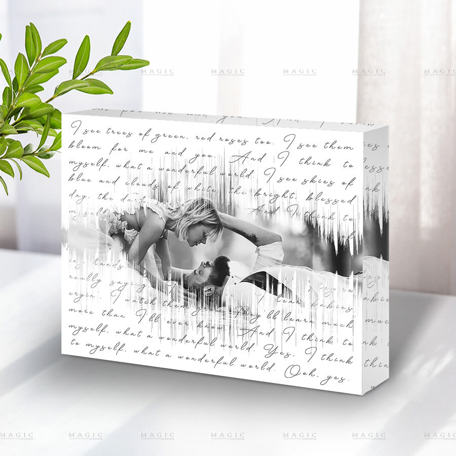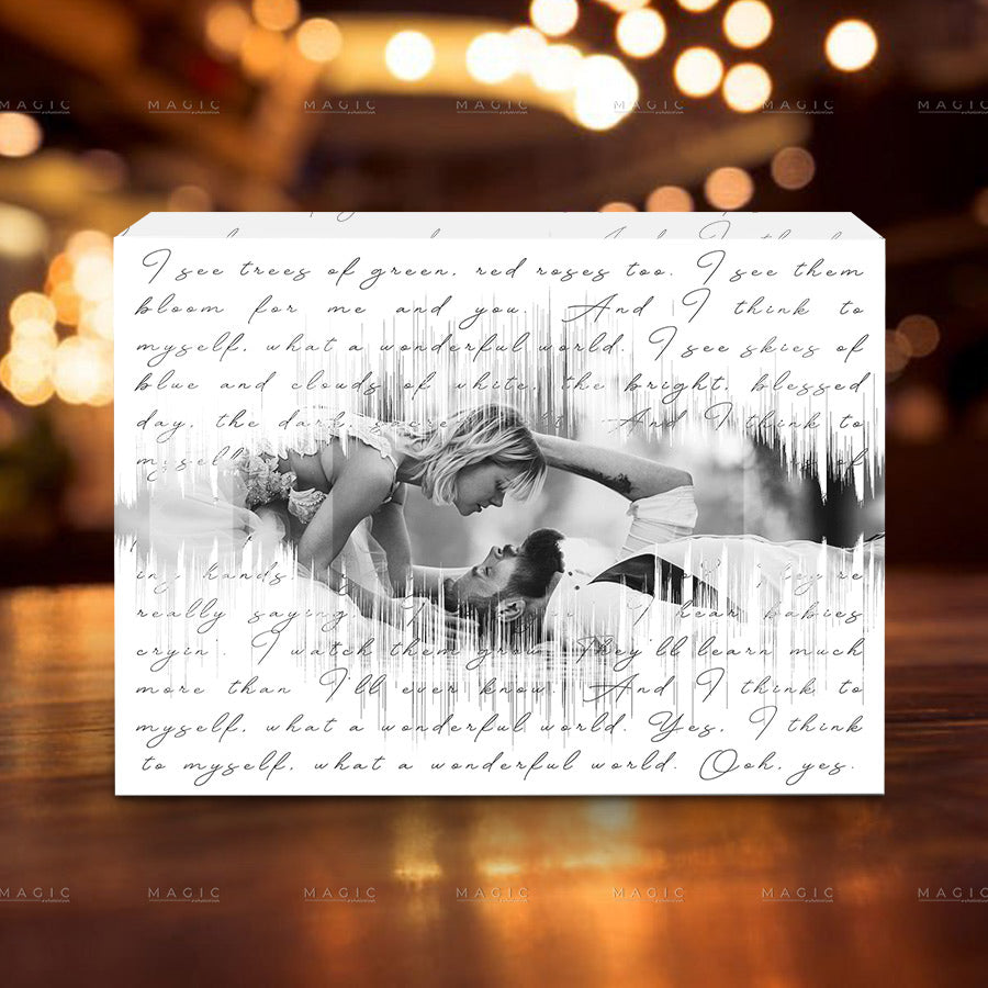 The song lyric art plaque can be personalized with the couple's names or a special picture for a truly unique keepsake. The beautifully crafted plaque is made from high-quality acrylic, making it a durable and lasting memento.