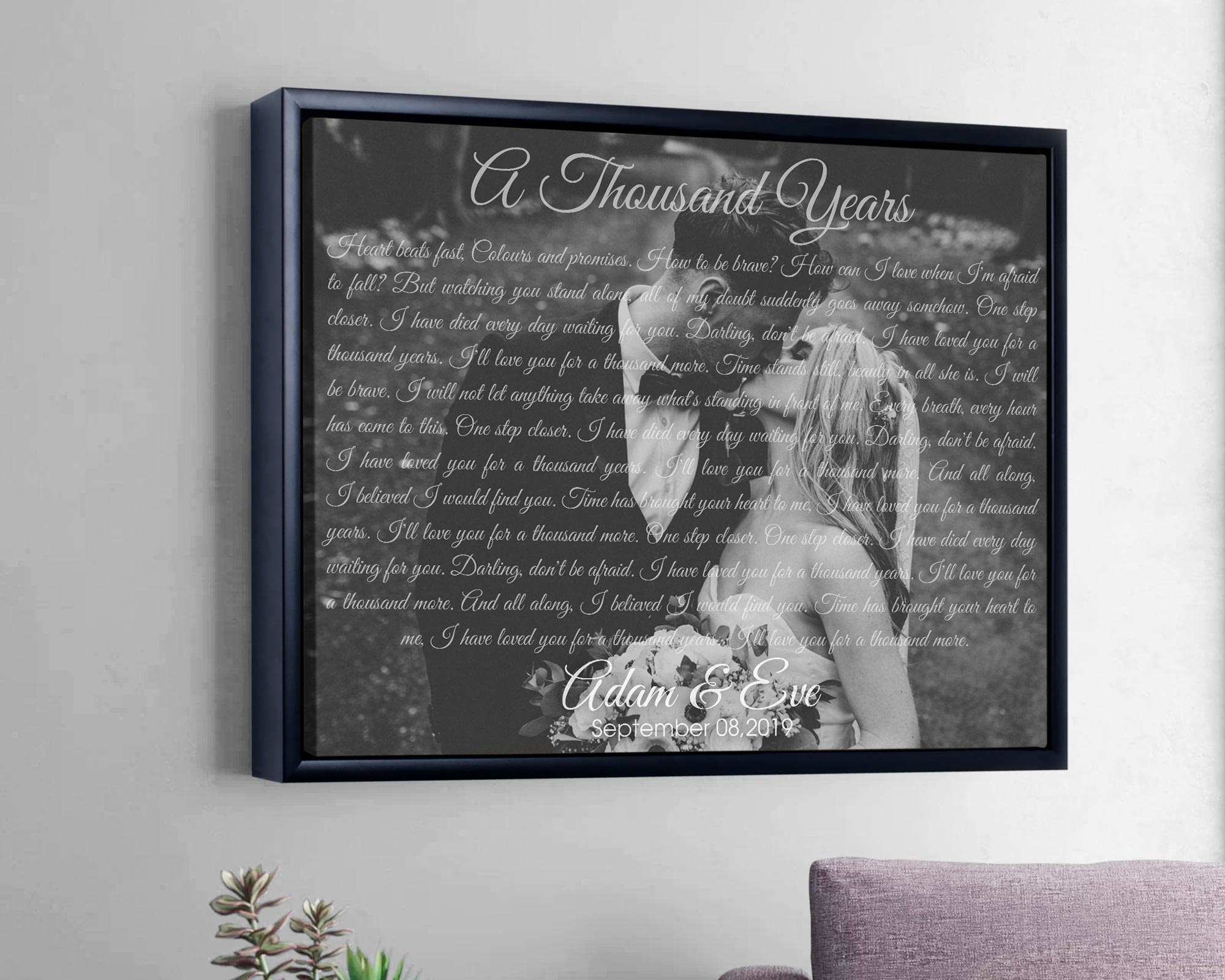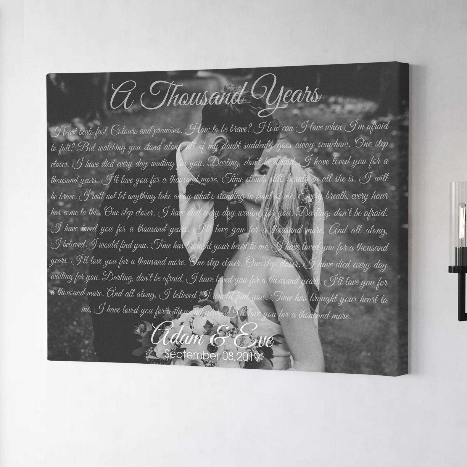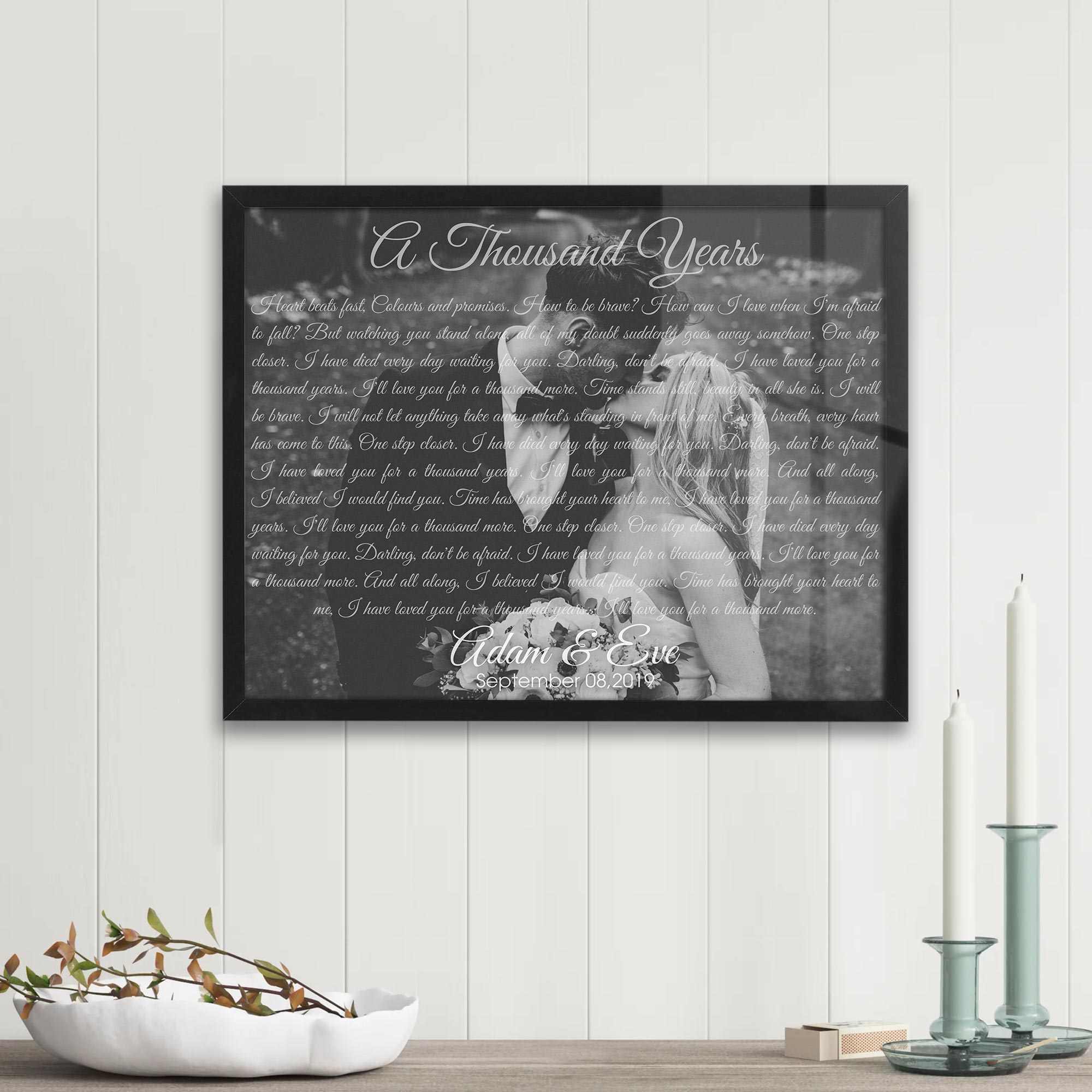 A meaningful gift for your other half on a loving wedding anniversary. He and you have given each other a lot of love and affection and now, together, you build a home. The lyrics of "A thousand years" stand out in the background of the best image of the two of you, and you just need to send us a picture of that best moment, we will give you a surprise.