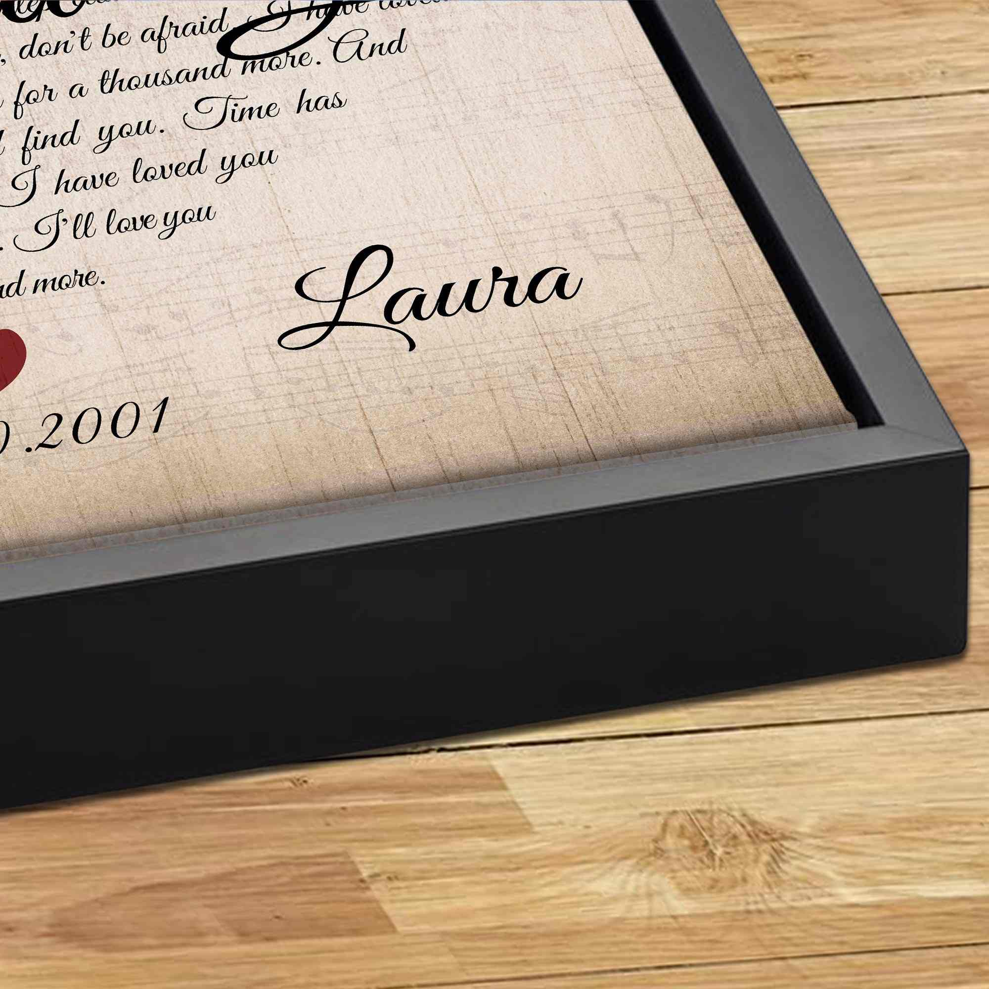No words can express all of your love for him. A beautiful love, a happy ending with a wedding. Now, the 1st anniversary will be even more meaningful with a canvas gift designed in rustic style combined with the meaningful song "A thousand years". So right now, are you ready to surprise him?