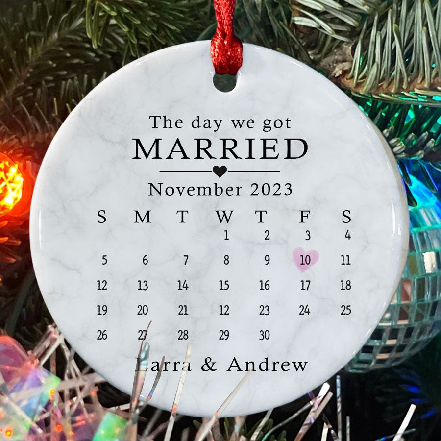 Celebrate your love and special day with wedding date ornament for your tree. The wedding gift Christmas ornaments display your names, wedding date, or a short message to immortalize your marriage for the holidays to come. Hanging proudly year after year, these Personalized Christmas Ornaments will become a treasured tradition reminding you of your commitment to one another.
