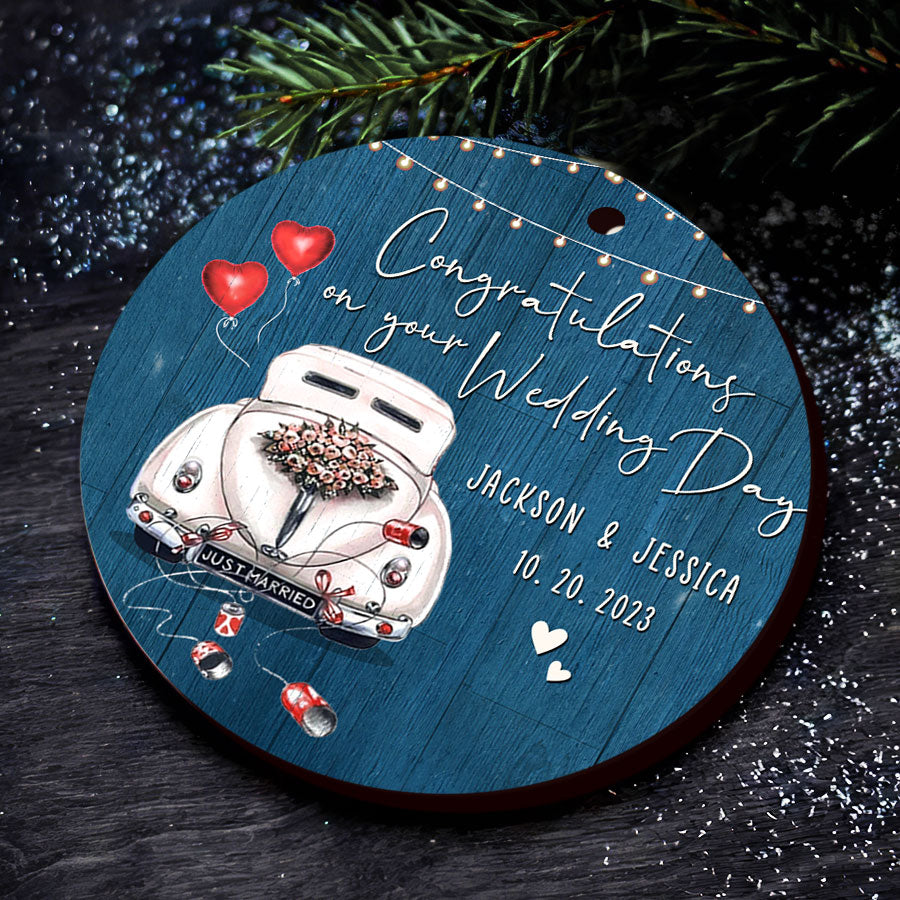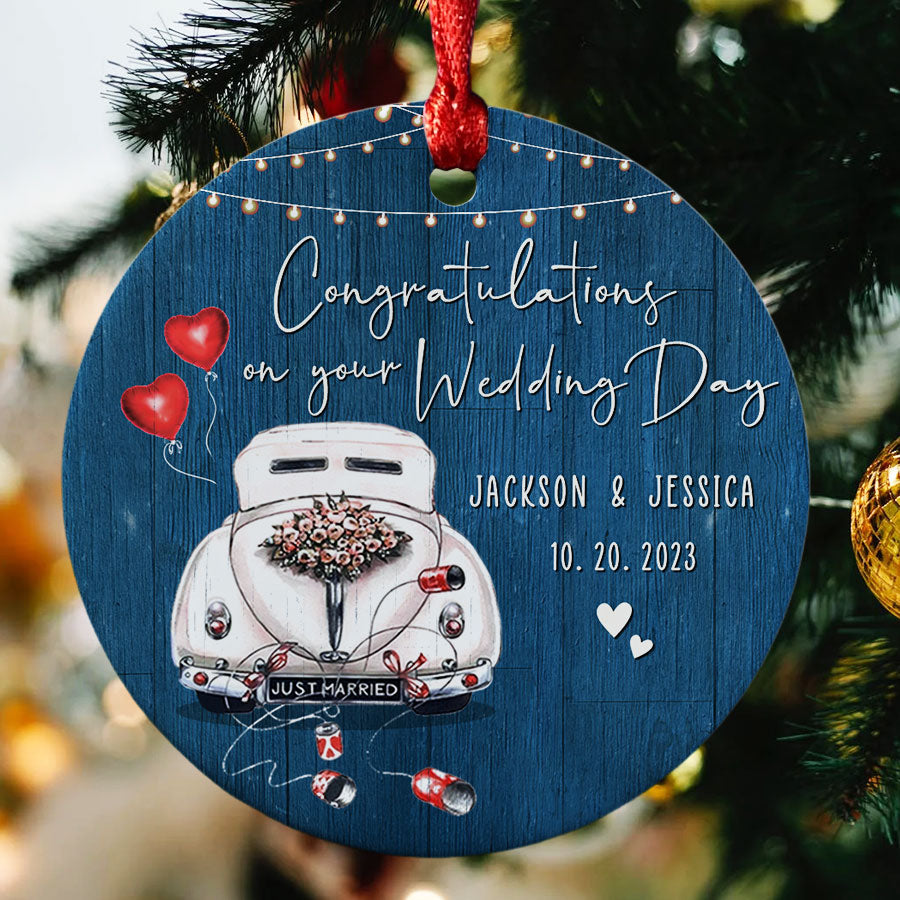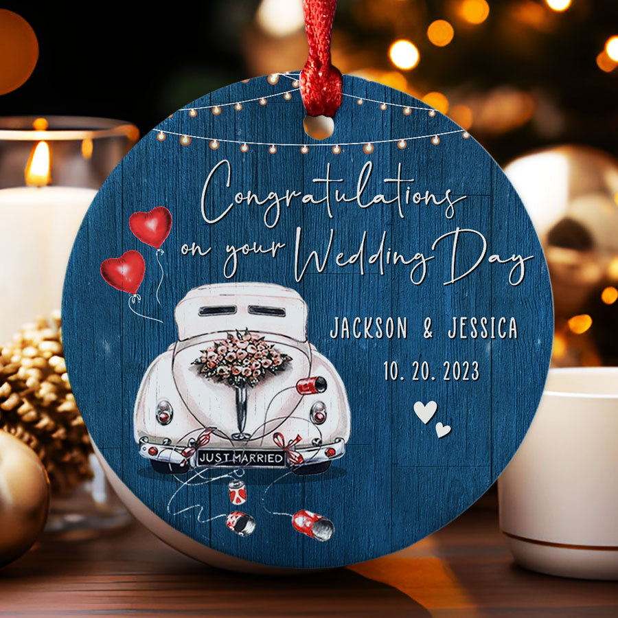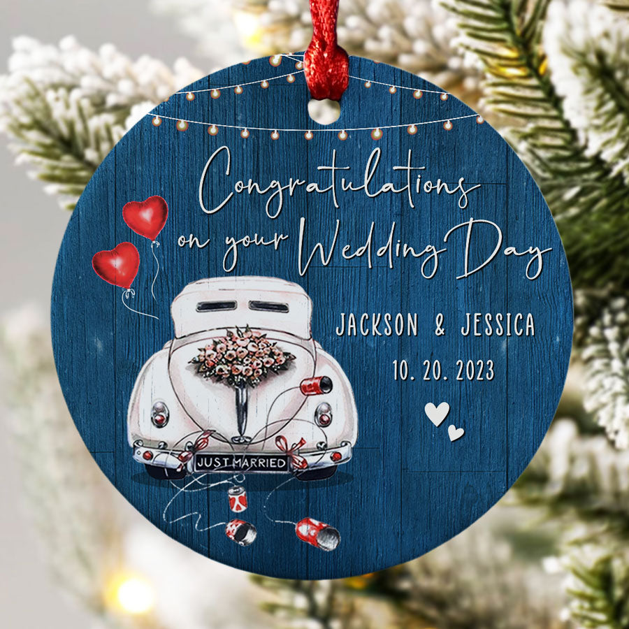 Celebrate your love and special day with wedding ornament for your tree. The wedding gift Christmas ornaments display your names, wedding date, or a short message to immortalize your marriage for the holidays to come. Hanging proudly year after year, these Personalized Christmas Ornaments will become a treasured tradition reminding you of your commitment to one another.