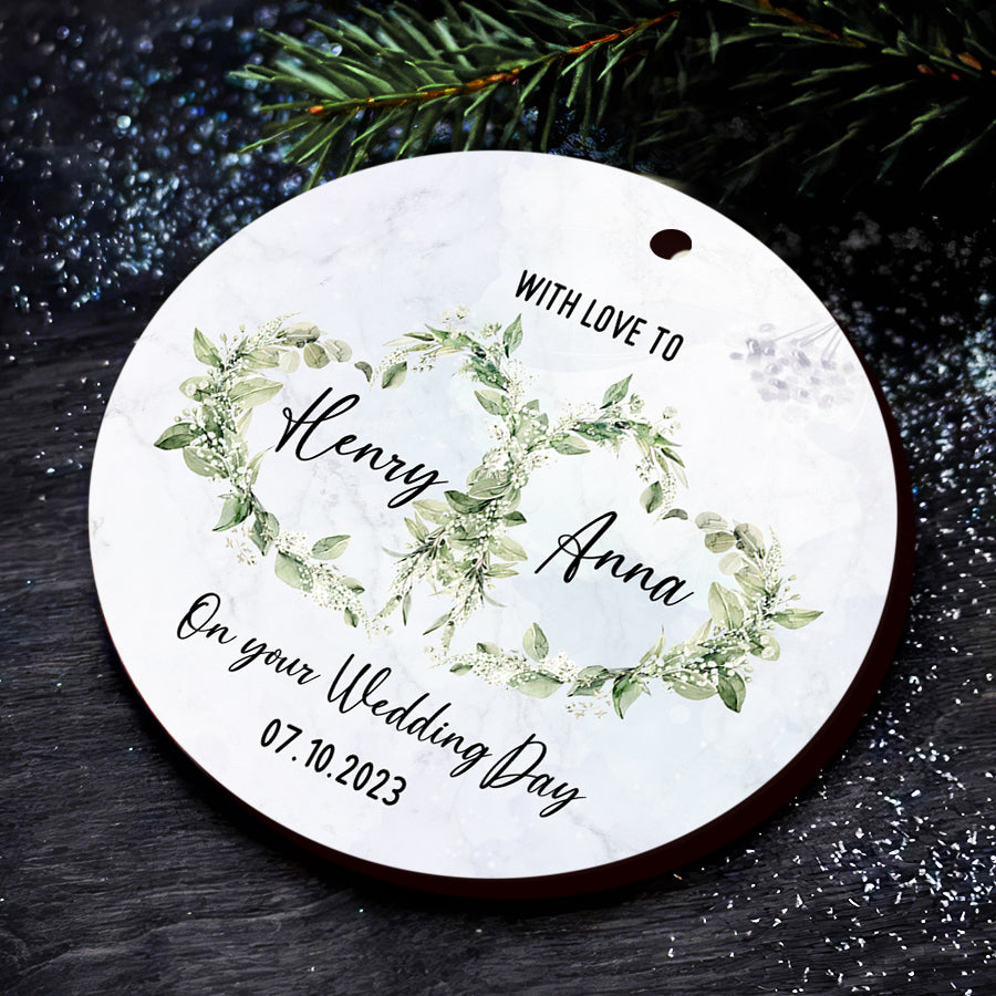 Celebrate your love and special day with wedding ornaments for your tree. The wedding gift Christmas ornaments display your names, wedding date, or a short message to immortalize your marriage for the holidays to come. Hanging proudly year after year, these Personalized Christmas Ornaments will become a treasured tradition reminding you of your commitment to one another.