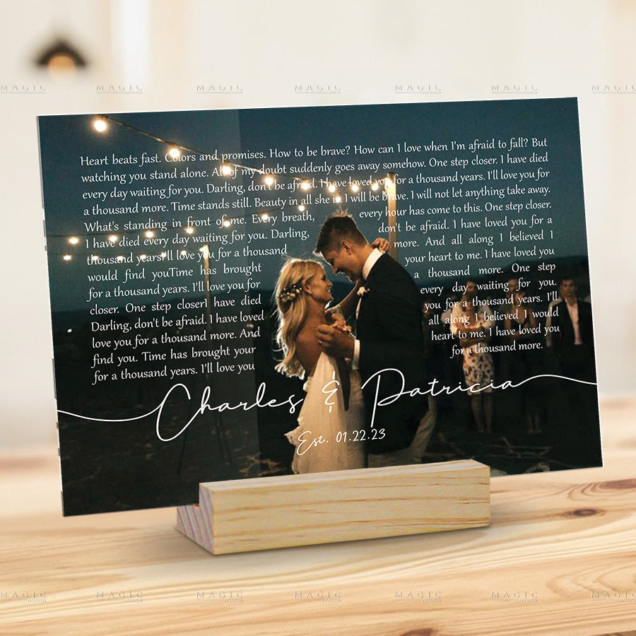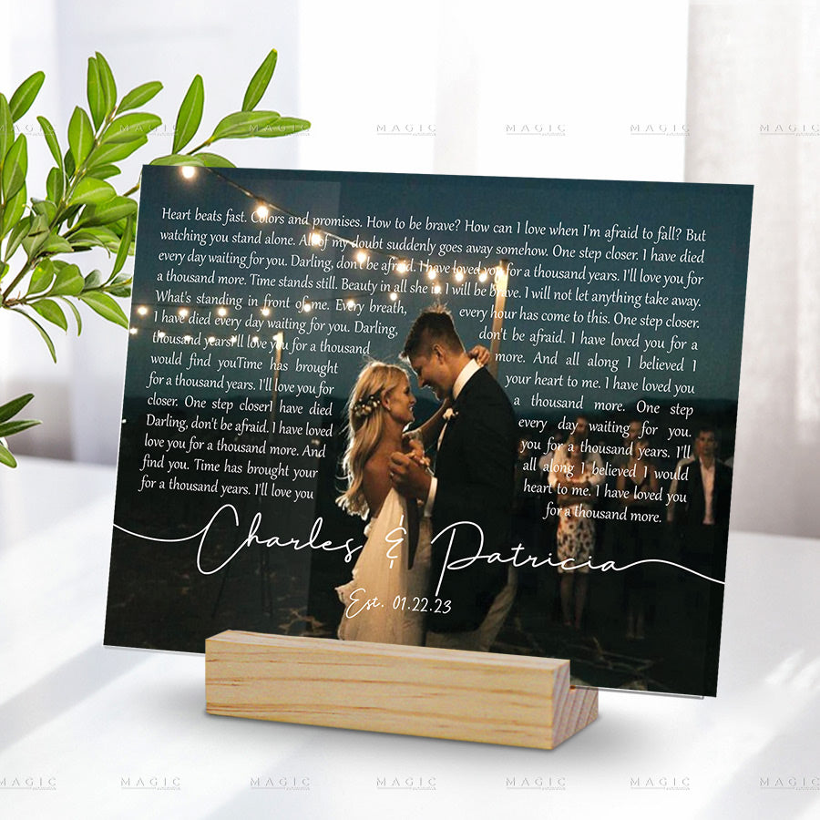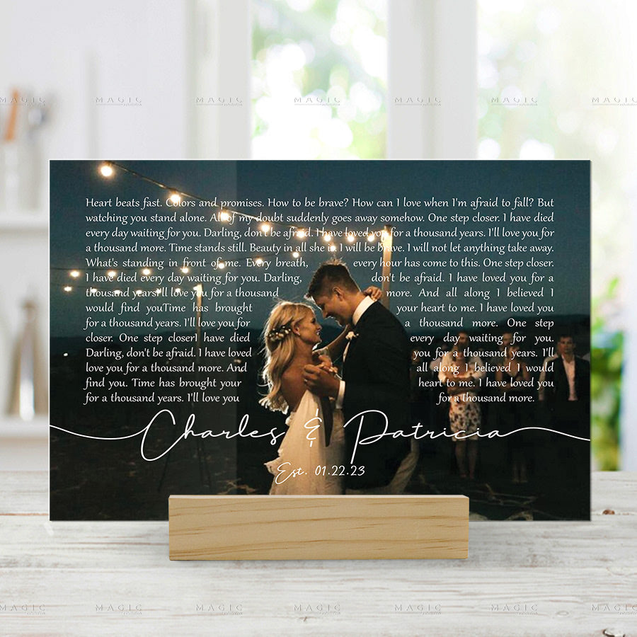 This stunning wedding song gift is crafted from durable acrylic, with a stylish and modern design that makes it a timeless gift. You can personalize the plaque with the couple's name or even a special picture of the two of you.