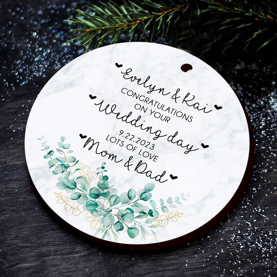 Celebrate your love and special day with wedding xmas ornament for your tree. The wedding gift Christmas ornaments display your names, wedding date, or a short message to immortalize your marriage for the holidays to come. Hanging proudly year after year, these Personalized Christmas Ornaments will become a treasured tradition reminding you of your commitment to one another.