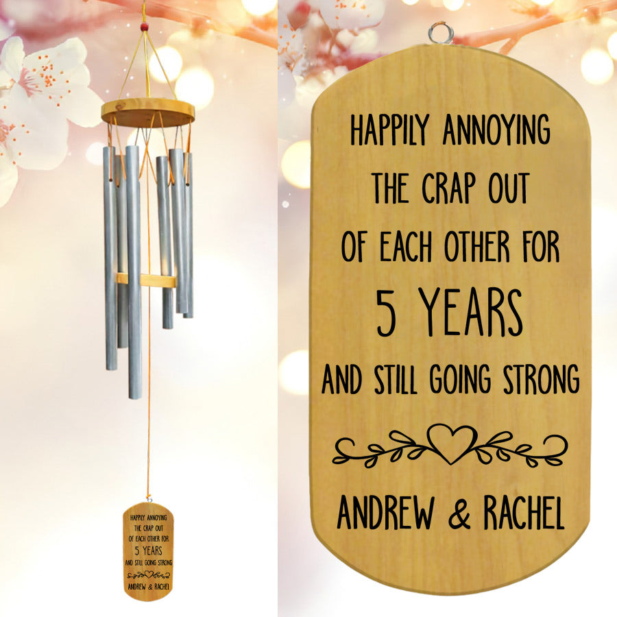 A chime gifted on your 5th anniversary celebrates not just years together but the moments woven into your shared history. Each tone carries a story, the happiness and hardships you weathered together made your marriage stronger. The wind chime serves as a loving reminder that joy resides in the simplicity of being present with each other, right now, as the wind lifts the music into the air.